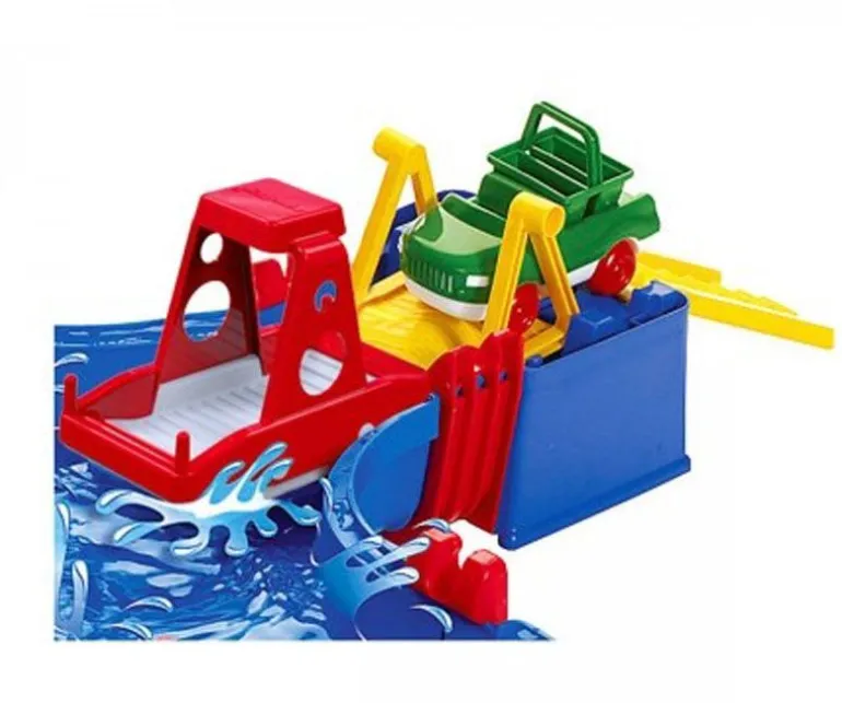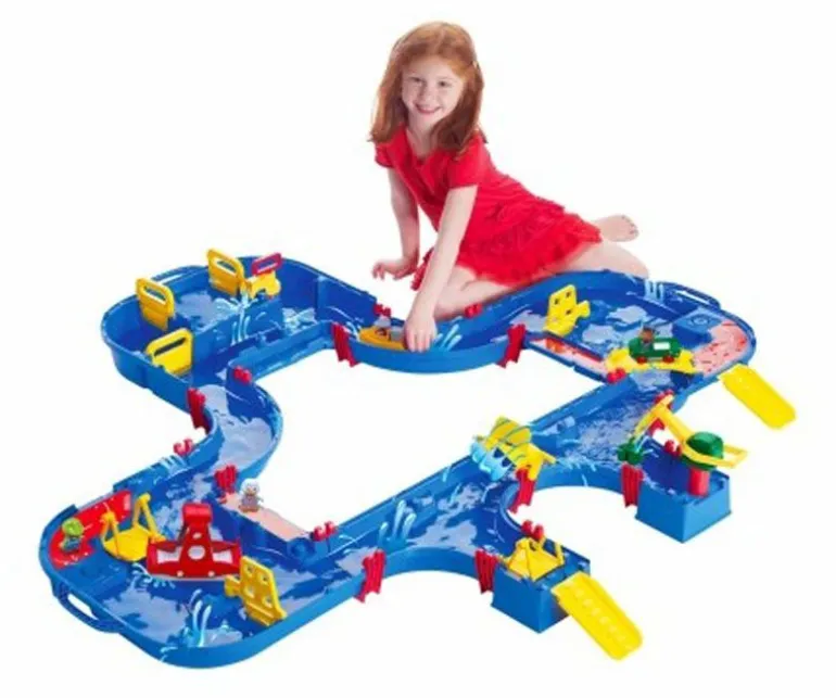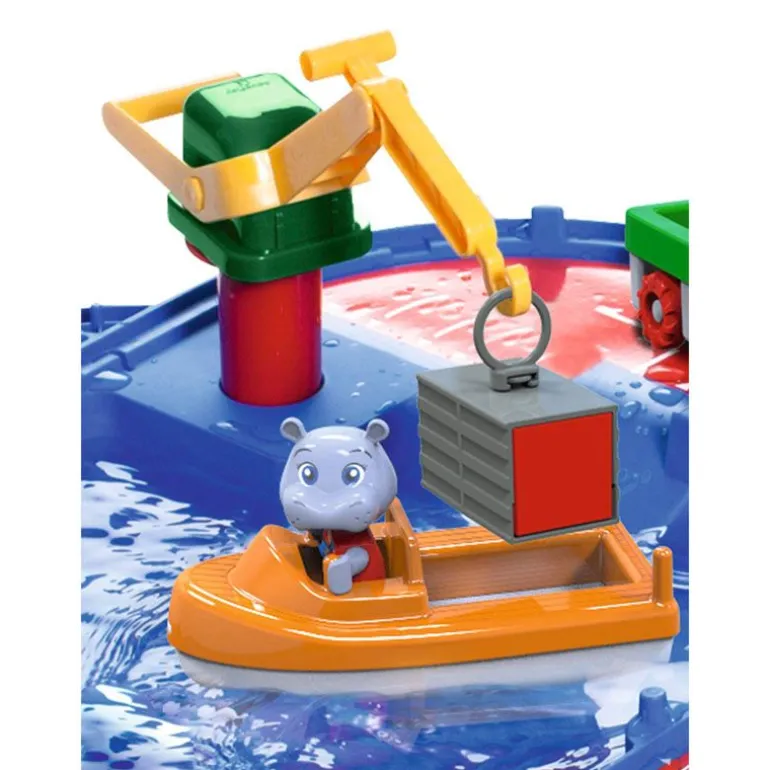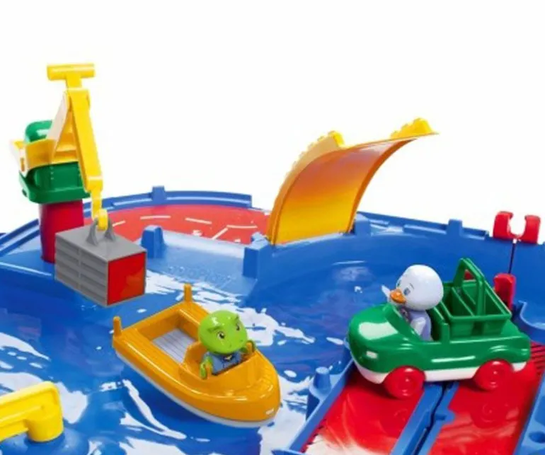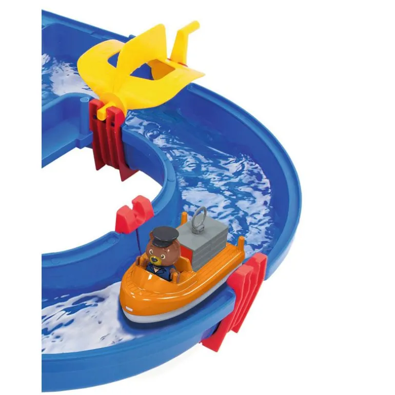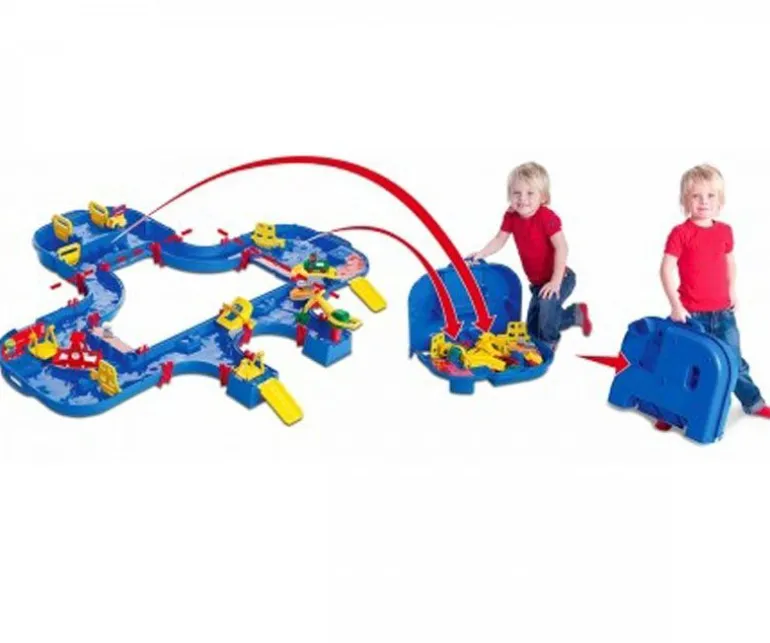Morsom og spennende vannlek som kan brukes av barn i flere aldre. Med dette kanalsystemet kan barna lære seg om vannets bevegelse, og selvsagt ha det så moro som bare det! Dette store AquaPlay settet inkluderer hele AquaPlay figur-familien; bjørnen kaptein Bo, flodhesten Wilma, anda Lotta og frosken Nils.Flytt og manuvrer båtene gjennom kanalene, pump vann inn i slusene for å løfte dem; og bruk kranen for å laste.Kan brukes både ute på sommeren eller inne på badet ellers i året. AquaPlay kofferten pakkes og ryddes lett sammen. Med i settet følger en ferge, en lastebåt, en amfibiebil (bil som kjører på både vann og land) og fire figurer. Ferdig montert er settet hele 145 x 160 x 22 cm. Anbefalt alder fra 3 år.