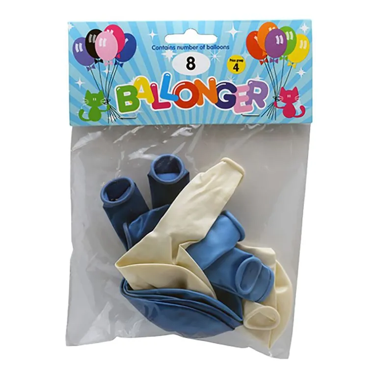 Pakke med 8 stk latex ballonger i mørk blå, lys blå og sølv.