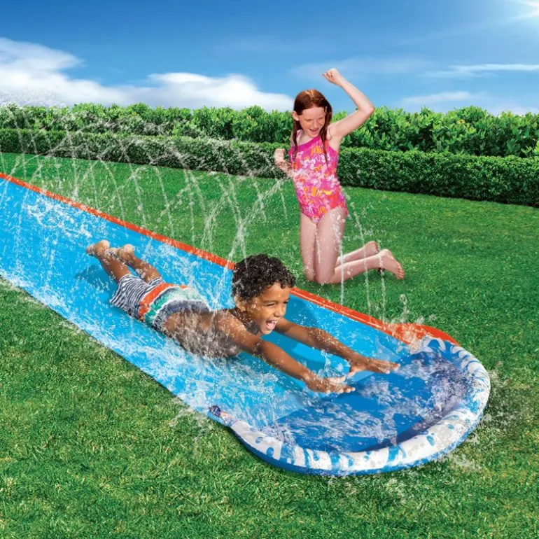 Ta sats, sett fart og vær den første til å skli ned Speed Blast vannsklien med vann som stråler opp fra kanten og kjøler ned! Sklien måler ca 4,88m i lengden og 71 cm i bredden, og det er bare å brette ut og koble på vannslangen for morsom lek i hagen.