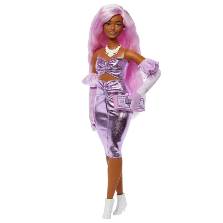 - Denne elegante Barbie-dukken er ikledd en lilla kjole med metallisk finish