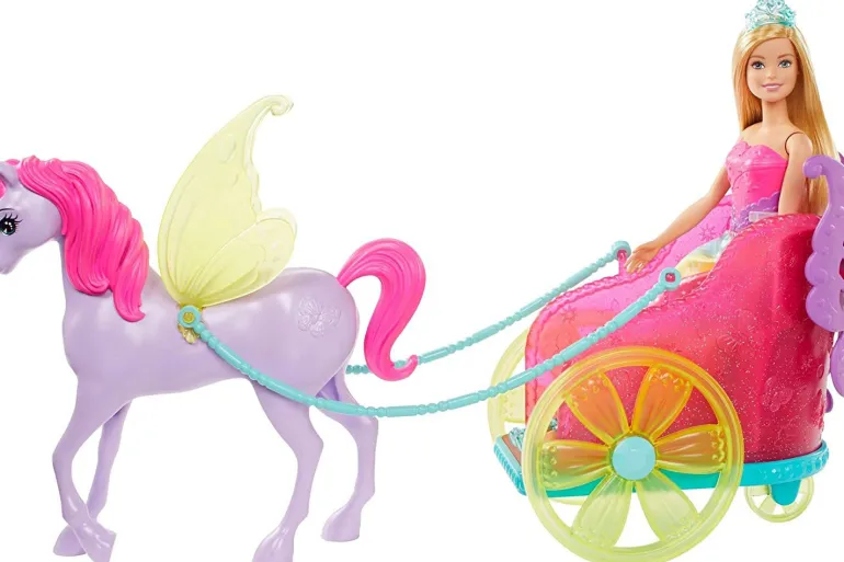 Barbie har funnet fram hestekjerre og er klar til å dra ut på magiske eventyr med Pegasus.Hestekjerren kan festes til Pegasus og dras framover på hjulene. Barbie prinsessedukken har på seg en flott kjole med regnbueskjørt og sommerfugl motiv, og en flott tiara. Barbie prinsessedukken kan både sitte og stå i kjerren ved å sette dukken i festet på den lilla sommerfuglen.Passer fra 3 år+