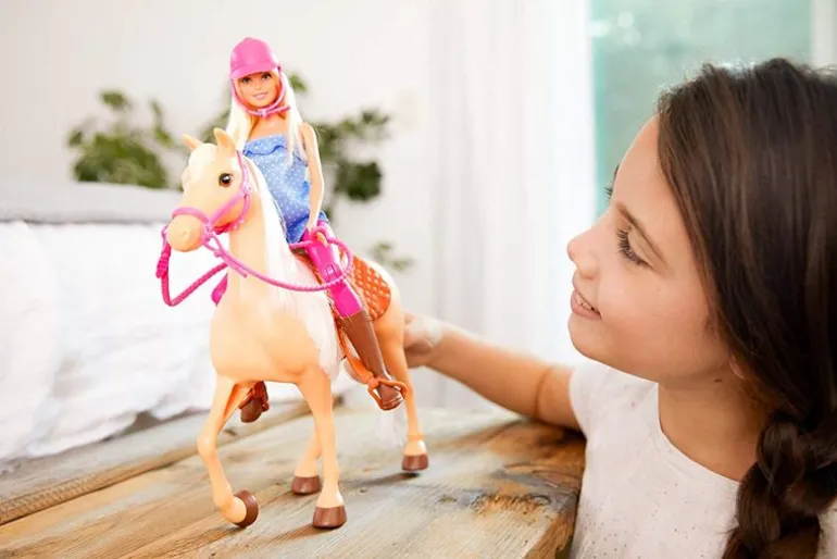 Barbie og hennes nydelige beigefargede hest er bestevenner og elsker å ri på lange turer sammen. Hesten har lys manke og hale. Hesten er utstyrt med sal og hodetøy. Barbiedukken har på seg en flott topp med hvite prikker, hjelm som du kan ta av og ridestøvler. Føttene på barbiedukken er bevegelige. Barbiedukken måler 29cm. Anbefalt alder: 3+