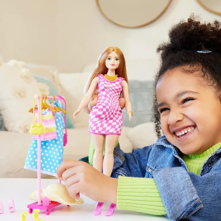 - Garderobeinspirert Barbie-sett med antrekk, stylingtilbehør og møbler