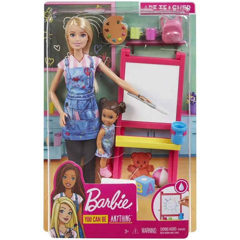 Barbie karrieredukker og lekesett inspirerer barna til å frømme stort og sikte høyt! Nå har Barbie funnet sitt nye yrke som kunstlærer hvor hun kan inspirere barna til å bruke kreativiteten sin. Den lille jenta er har tatt på seg skolesekken og er klar for en morsom dag på skolen. Fyll den blå bøtten med vann, dypp penselen i vannet og start å male ditt eget kunstverk på tavlen.