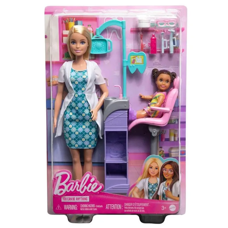 - Barbie med blondt hår i tannlegeuniform med smilende uttrykk