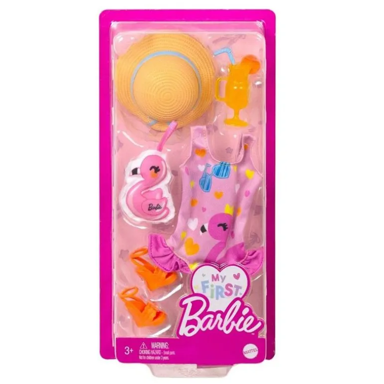Min Første Barbie er en kolleksjon til førskolebarn. Min Første Barbie -motepakkene består av store dukkeklær og matchende tilbehør. Med enkel lukking er det lett for mindre barn å kle på dukkene. Velg mellom temaer som stranddag, danseskole, bursdagsselskap og leggetid for å skape gode utgangspunkter til spennende historier. Denne motepakken kommer med en flott rosa badedrakt som har motiv av en søt flamingo. I tillegg følger det med et par oransje sko, en hatt, flamingo dekor og en tropisk drink.