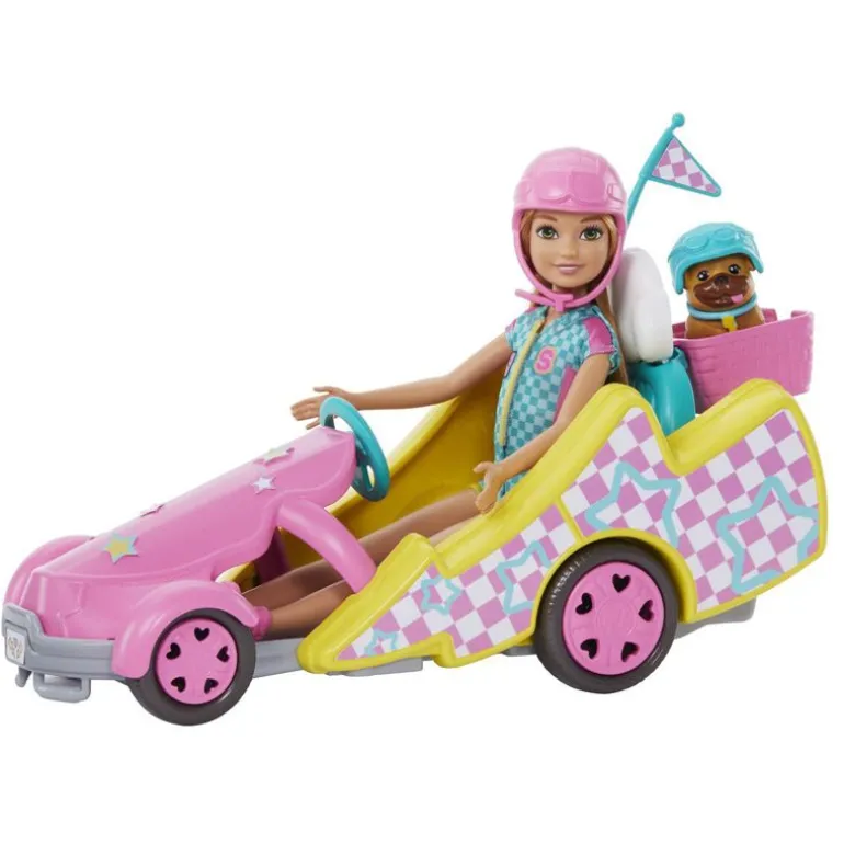 Svi gummi med Stacie-dukken og gokarten hennes! Gokarten har fungerende hjul, rutete racing-dekor, avtagbart flagg og en kurv til valpen, og det ser ut som den har kjørt rett ut av animasjonsfilmen Barbie and Stacie to the Rescue. Det følger også med et klistremerkeark, slik at barna kan tilpasse gokarten. Stacie-dukken er kledd i et racingantrekk og er klar til trå klampen i bånn. Ikke glem hjelmen! (Det følger også med hjelm til den firbente passasjeren.)