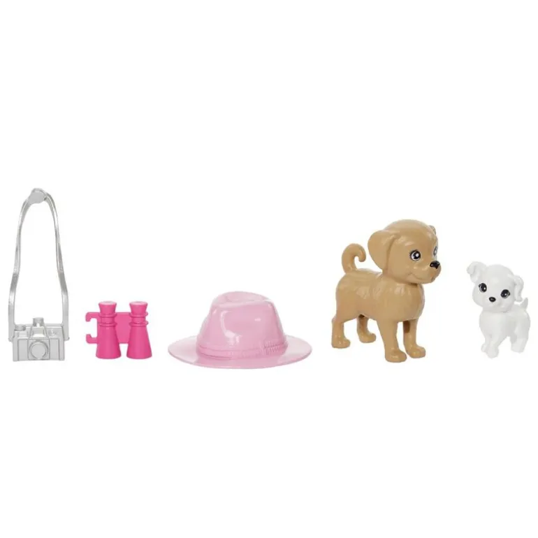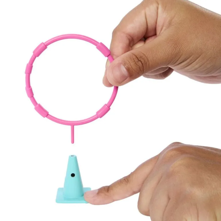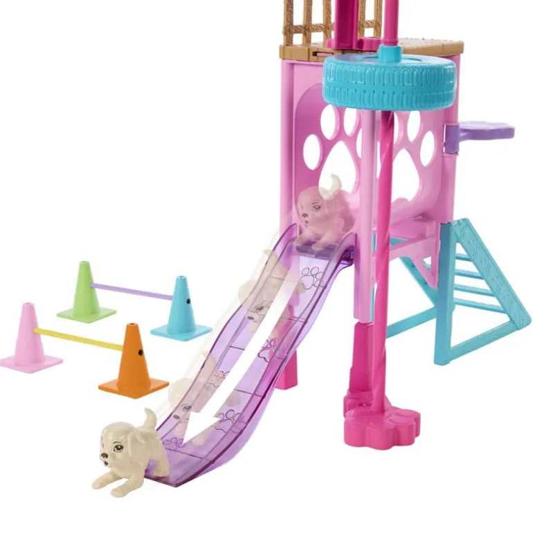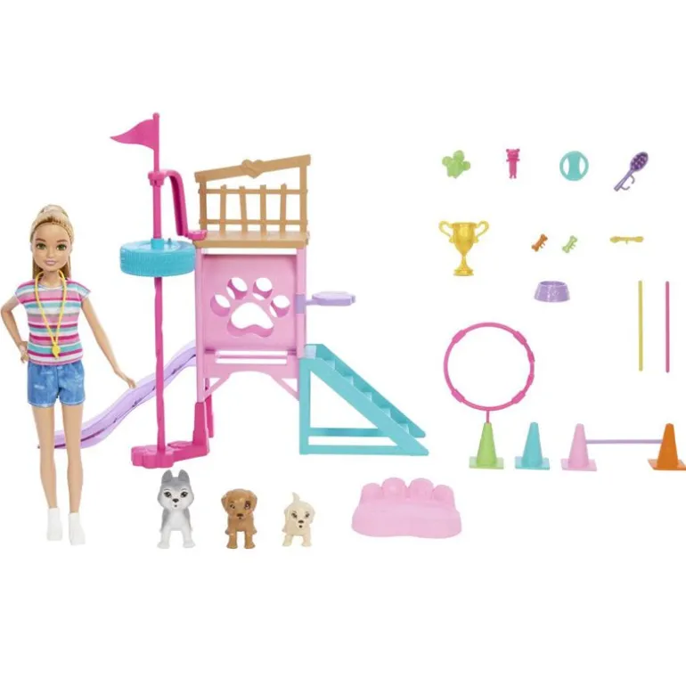 Akkurat som i filmen Barbie and Stacie to the Rescue kan barna hjelpe Stacie-dukken med trene og passe på de pelskledde vennene, med denne byggbare hinderbanen og tilbehør som hundeleker, godbiter, en pokal og hundeseng!