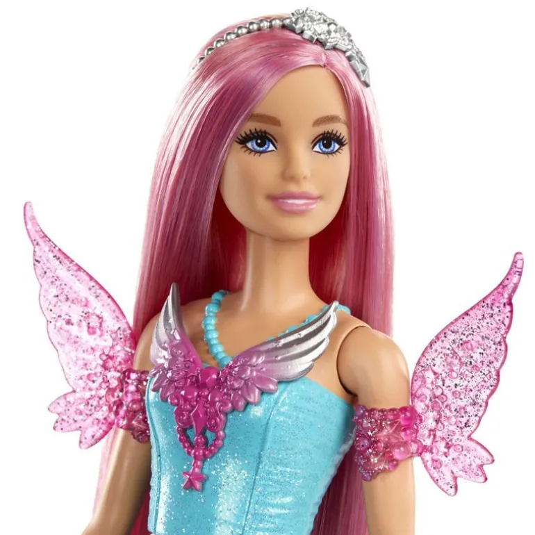 Denne Barbie -dukken kan ikke beskrives som annet enn magisk, med langt fantasihår og glitrende kjole. Barbie «Malibu» Roberts-dukken er kledd i et glitrende antrekk med blå overdel og blått og lilla tulle skjørt, inspirert av antrekket hennes fra Barbie A Touch of Magic. To kjæledyr og stylingtilbehør lager enda mer eventyrlig moro. Bruk kammen til å gre og style det lange rosa håret hennes og dekorer med hårpynten.