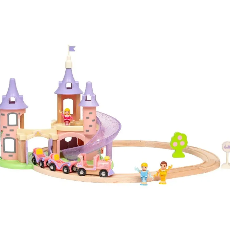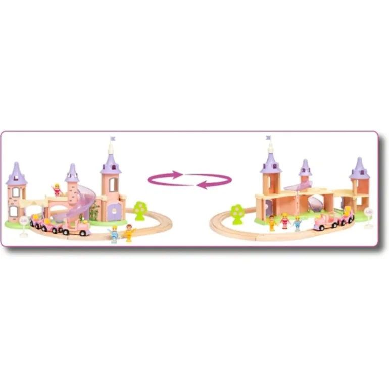 Gå om bord i det rosa prinsessetoget og inn i slottet gjennom den flotte porten. Deretter kan du åpne slottet som et dukkehus og leke med karakterene inni slottet, hvor de kan synge og danse. Gå helt opp i det høyeste tårnet og se utover den fantastiske verdenen og rutsje deretter ned den magisk glitrende slott-rutsjebanen for å komme deg hurtig tilbake på toget og bli med på enda et fantastisk eventyr.