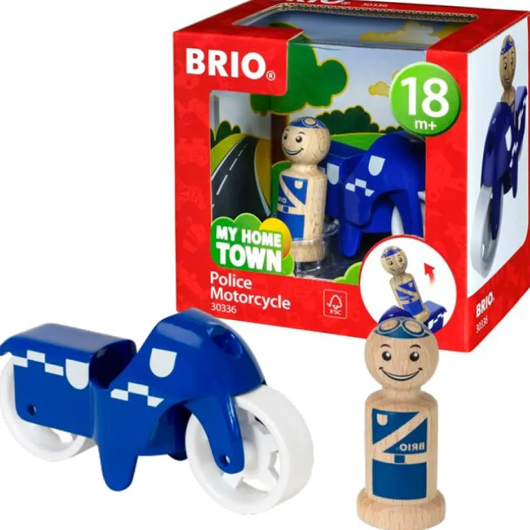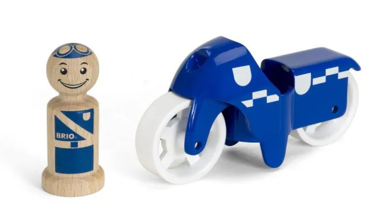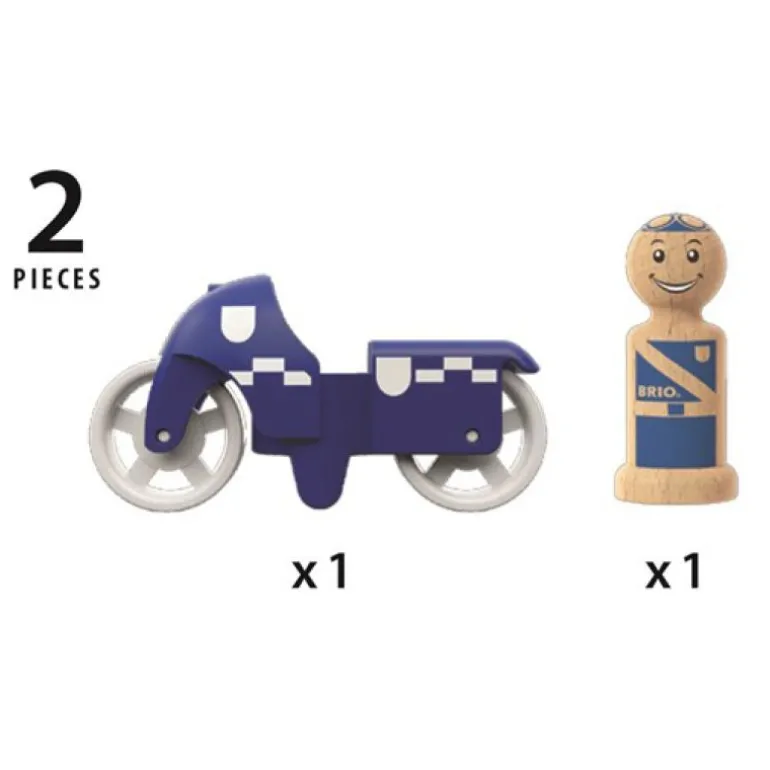 Politimannen elsker jobben sin: å fakke tyver. Bli med på eventyret! Sett ham på motorsykkelen og følg etter bilen – den er full av gull. Og når du har fanget dem, venter nye oppdrag. Denne stilige og solide politimotorsykkelen i tre er perfekt for de små, med solid trefigur som får plass i motorsykkelen.