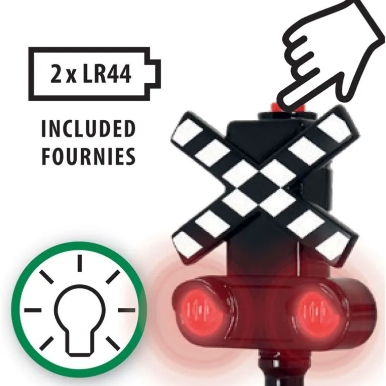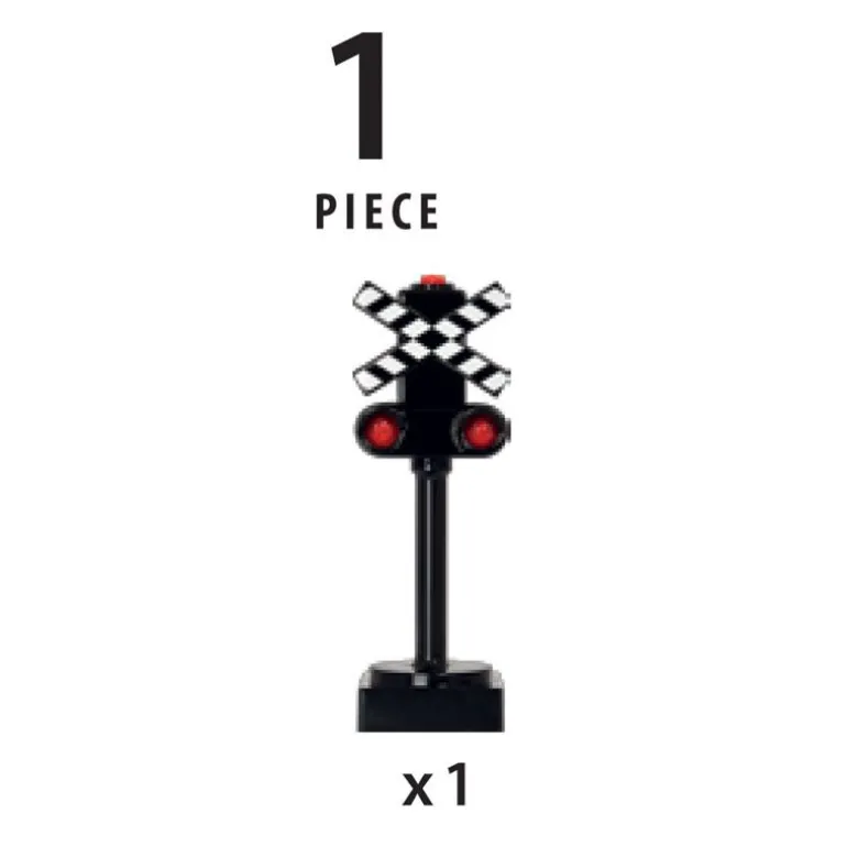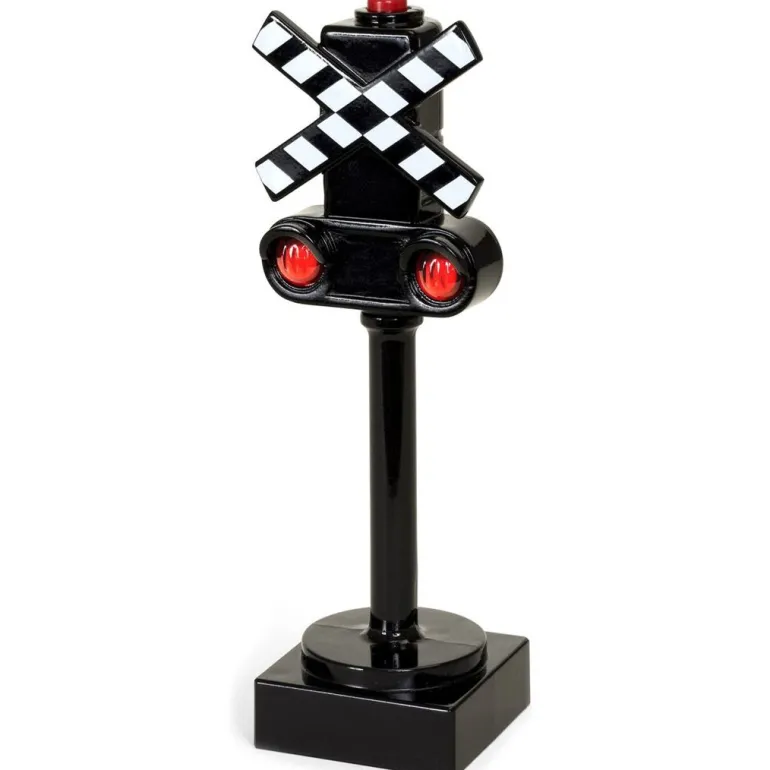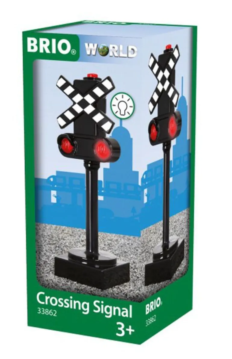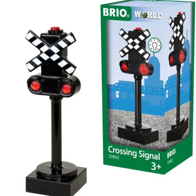 Pass på, et tog kjører forbi! Trykk på knappen på skiltet, start det røde blinkende lyset og la toget kjøre trygt forbi. Flott! Vi tar en runde til. Du er ansvarlig for lyssignalet, og det er en viktig oppgave. Skilt for planovergang, med lys som blinker når man trykker på knappen. Passer med BRIO World og er et flott supplement til BRIO lyssignal.