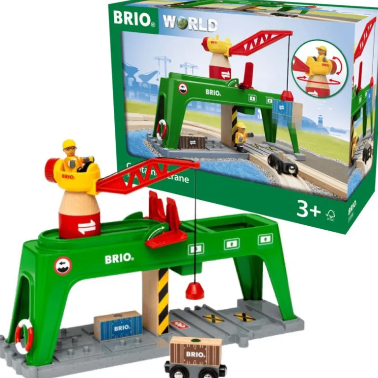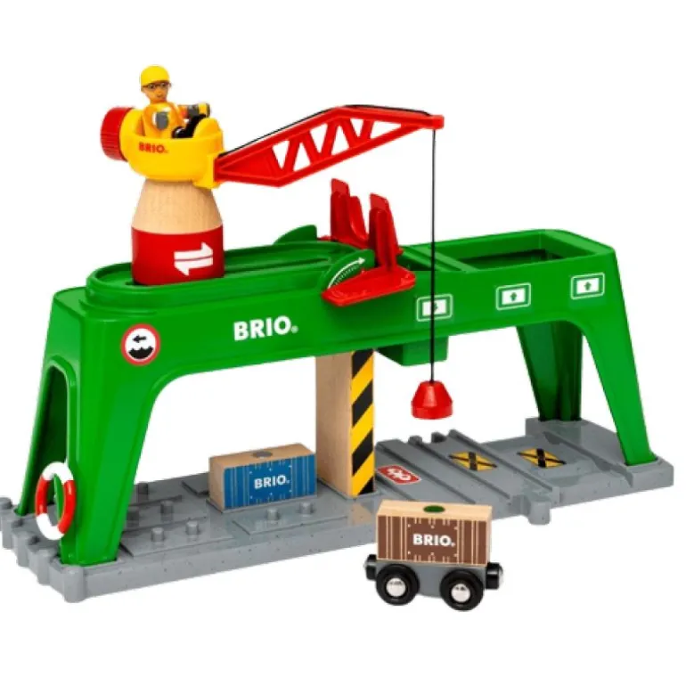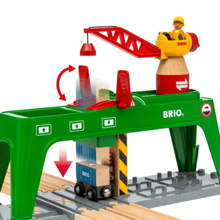Det er ikke noe problem å administrere alle de tunge fraktcontainerne ved BRIO World-dokken med 33996 Kranen. Sett deg på toppen av dette store, grønne jernbanetilbehøret og sett deg på jobb. Ta tak i en av beholderne med den magnetiske kroken, roter og skyv den store kranen på plass over skinnene. «Litt til venstre, litt til høyre. Perfekt!». Senk trelasten på plass ved hjelp av vinsjen og lås den inn med det røde lokket før den faller perfekt ned på den ventende vognen under.