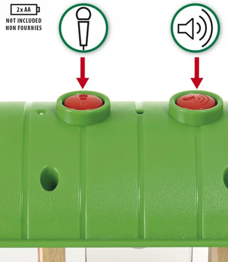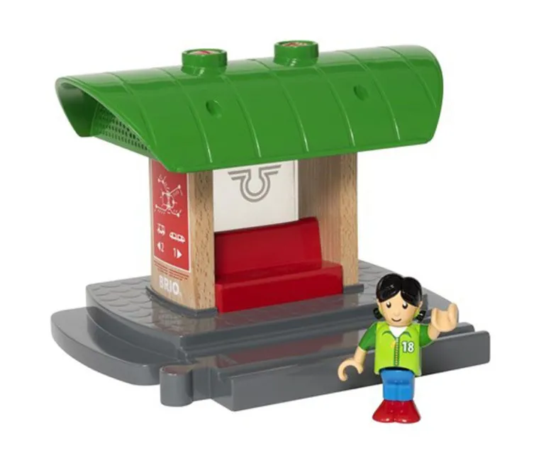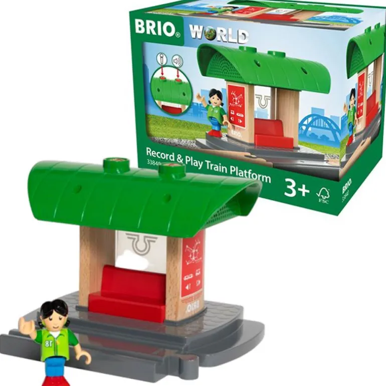 Hvem sier at et tog ikke kan være riktig moro? Denne geniale lille togstasjonen er en ny utgave av BRIOs populære spill inn- og av-funksjon Trykk på knappen og snakk. Trykk på den andre knappen for å høre det du akkurat spilte inn. «Tester, tester! Hvem vil kunngjøre det neste toget som kommer inn på stasjonen?»