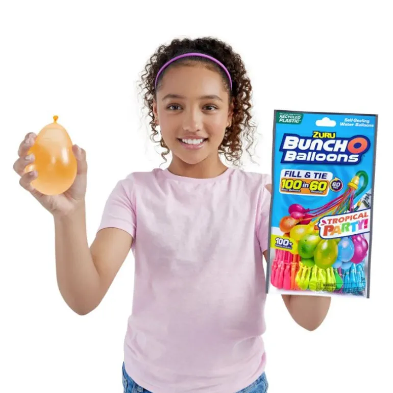 Gjør deg klar til fest, med Bunch O Balloons Tropical Party vannballonger! Fyll og bind 100 Tropical Party-ballonger på mindre enn 60 sekunder med disse selvbindende vannballongene! Med nyskapende O-ringteknologi og raske fyllingsfunksjoner, si farvel til stresset og rotet ved å fylle individuelle vannballonger og si hei til uendelig moro!
