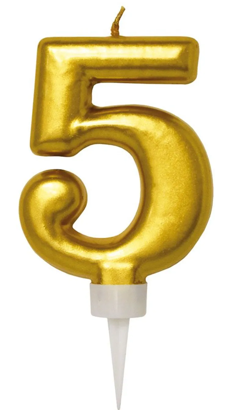 Det er jo ikke en skikkelig bursdagskake uten bursdagslys! Dekorer kaken med alderen til bursdagsbarnet med dette stilige stearinlyset i gull. Tallet måler ca. 8 cm i høyde og 6 cm i bredde. Pakken inneholder 1 bursdagslys med tallet 5.