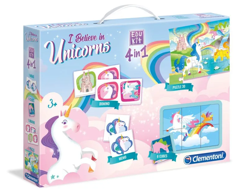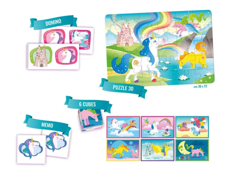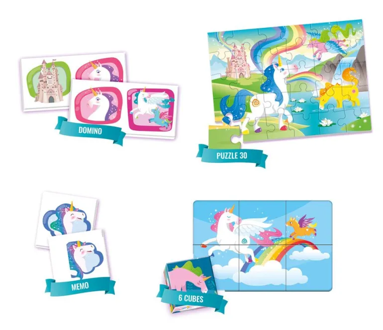 Morsomt og lærerikt sett med dominospill, puslespill med 30 biter, kubepuslespill med 6 kuber og et memo spill. Alt i flotte enhjørning motiver. Spillene lar barnet trene hukommelse, manøvrerbarhet og oberservasjon.