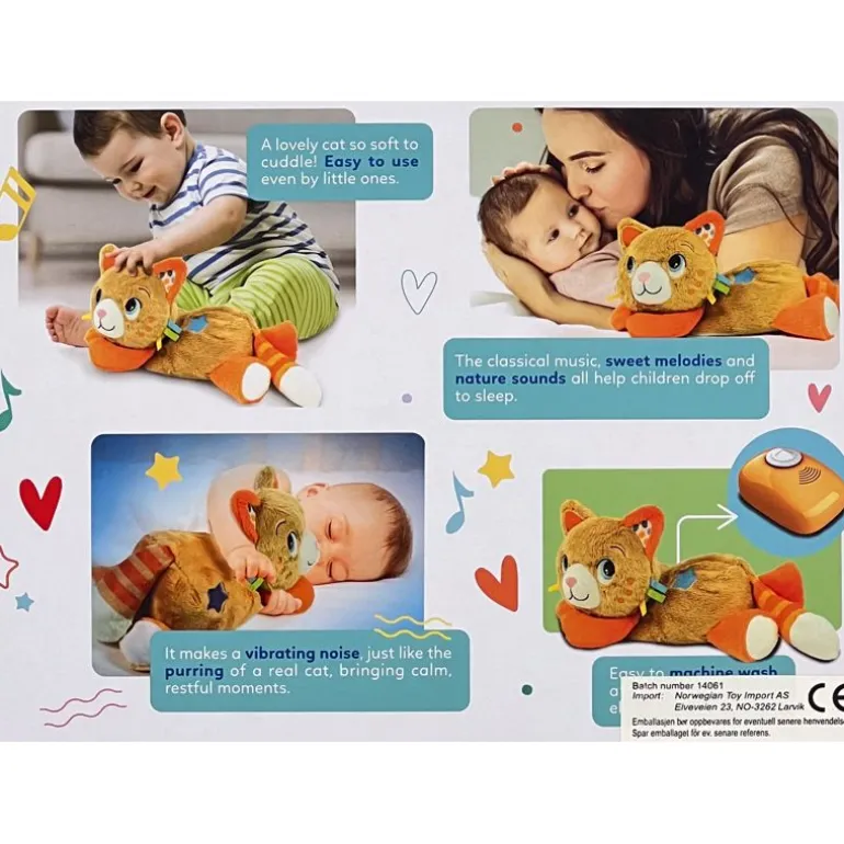 Den myke plysjen og rolige lydene bidrar til å skape en avslappende atmosfære som fremmer søvn og trygghet hos babyen din. Velg mellom klassisk musikk, søte melodier eller avslappende naturlyder, eller aktiver den beroligende vibrasjonen og dette plysjdyrret purrer som en ekte katt.