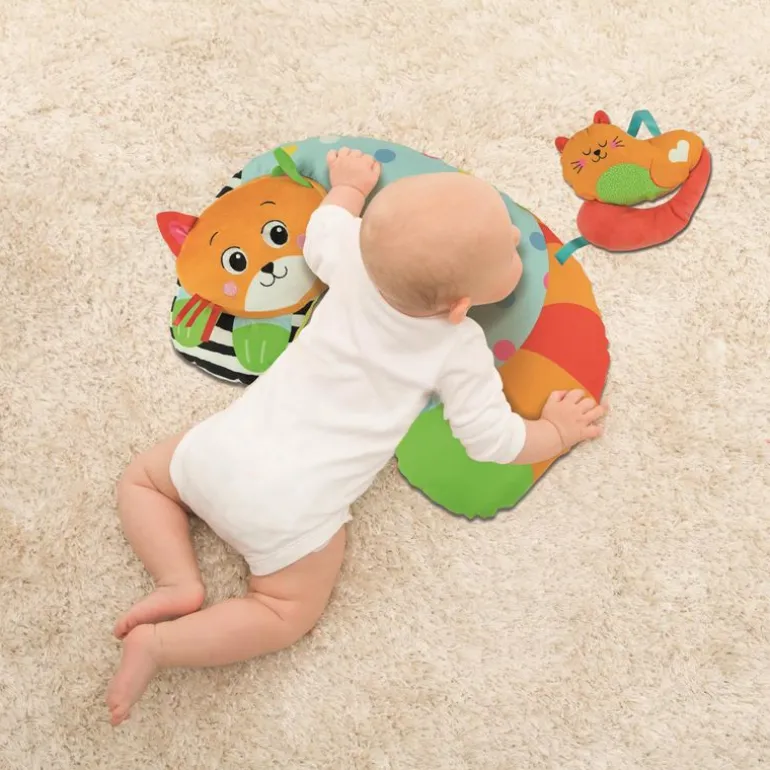Når de små er klare for å ligge på magen å utforske og leke er denne flotte mageputen fra Clementoni Baby perfekt å bruke! Mageputen er laget i deilige og myke materialer slik at den lille skal ha det mest mulig behagelig, og mageputen er designet i sterke iøyenfallende farger som garantert fanger oppmerksomheten. Mageputen er formert som en smilende katt med en liten søt kattunge som babyen kan ta og føle på. Det er også en praktisk bitering formet som et hjerte som er festet til mageputen.