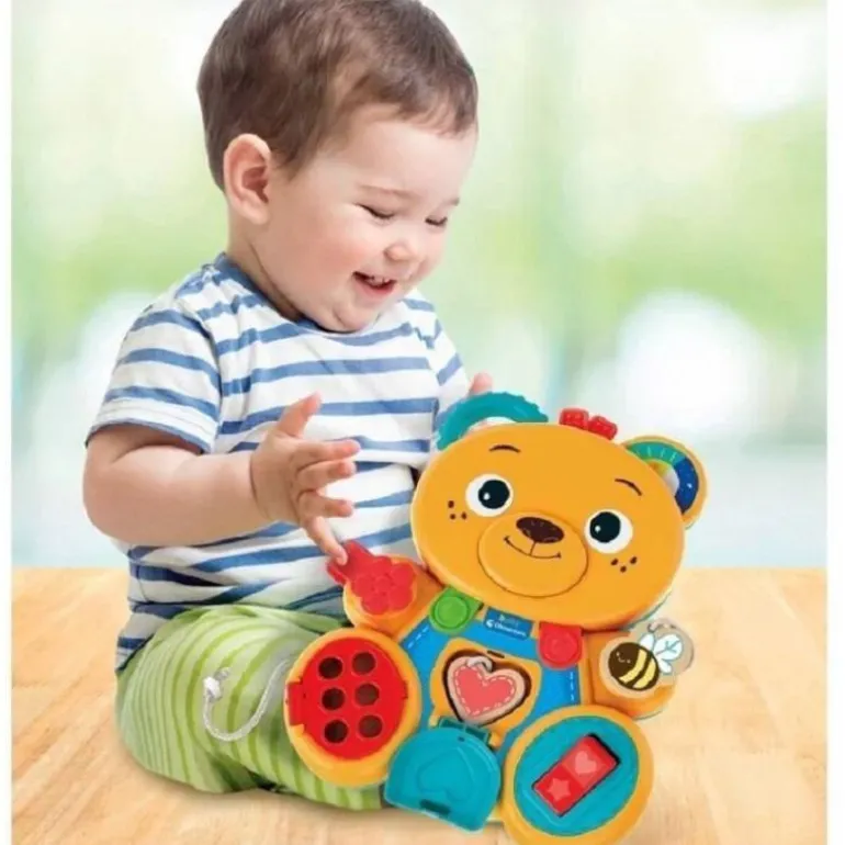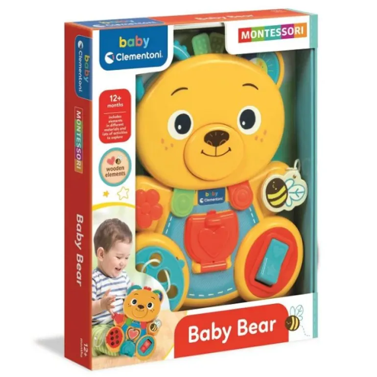En søt bamse med harde og myke elementer og tredetaljer. En leke inspirert av Montessori-metoden, full av aktiviteter som er designet for å trene opp fingerferdighet og konsentrasjon: tråden og knapphullene, klikk-klakk-bryteren, elementer som skal settes sammen, klaffen som kan åpnes og lukkes og mye mer.