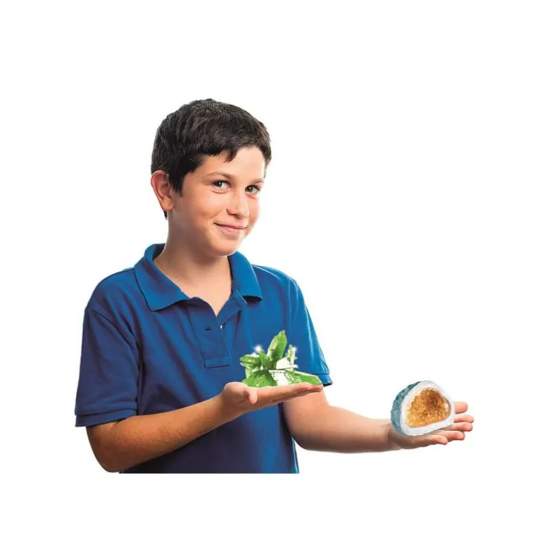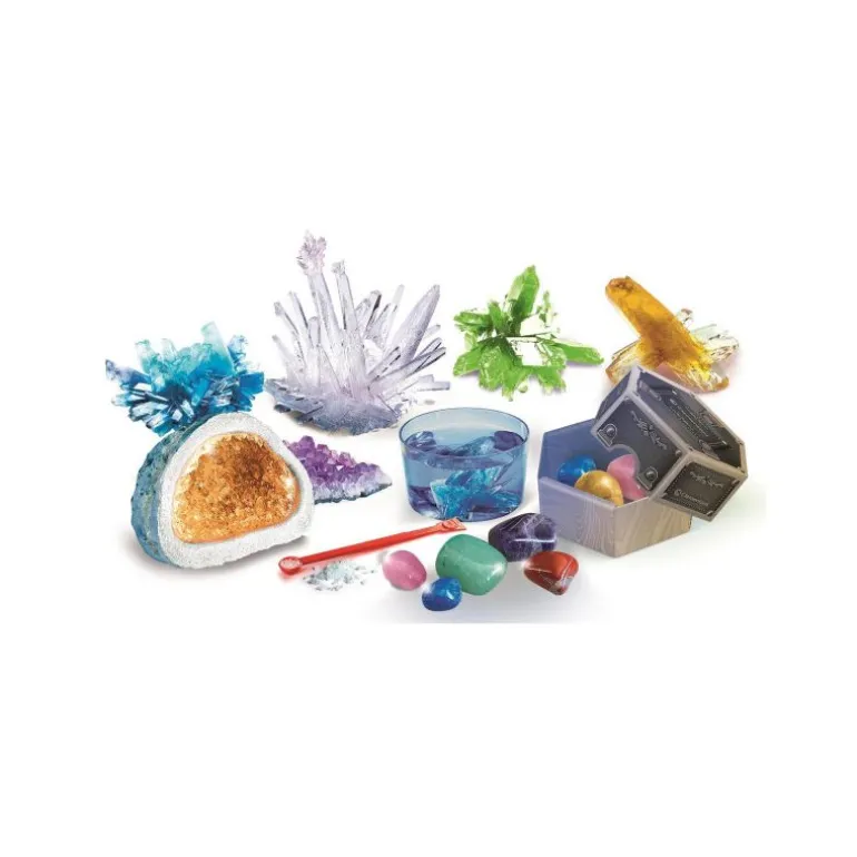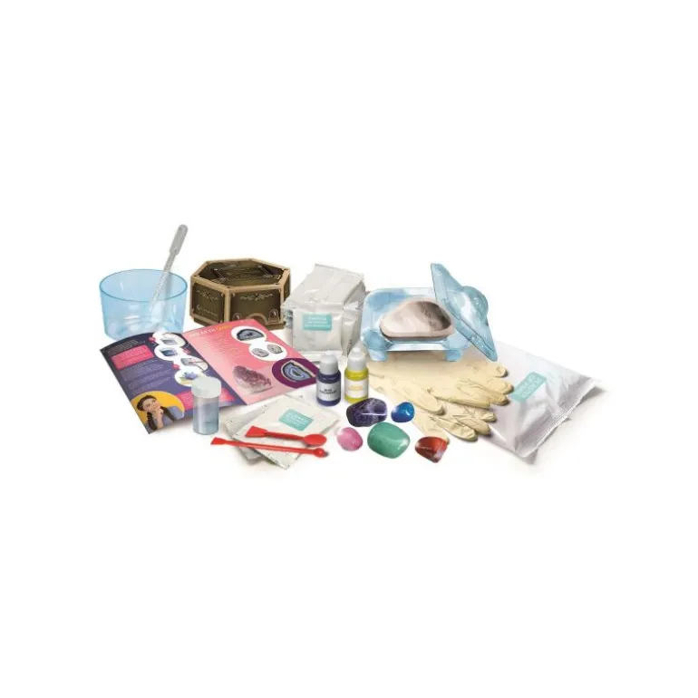Det er også mulighet for å lage superfargede gigantiske krystaller ved å følge instruksjonene for å utføre eksperimentene i den illustrerte håndboken. En form for å reprodusere en sjarmerende farget geode for å pynte med mange fargede krystaller. I den rike vitenskapelige håndboken kan barn også oppdage alle hemmelighetene til dannelsen av krystaller og de kjemiske reaksjonene til salter!
