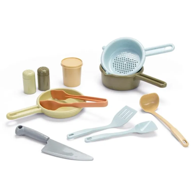 Kjøkkensett med gryte, panne og redskaper i fengslende trendfarger, laget av svanemerket bioplast, Dette kjøkkensettet inviterer til lek og læring, og er perfekt for både innendørs og utendørs bruk.