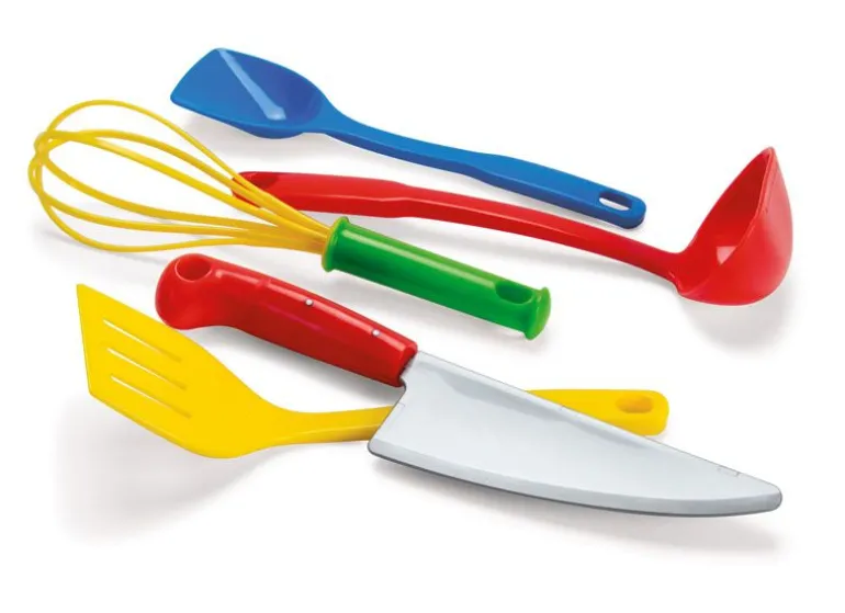 Sett med fem kjøkkenredskap i plast fra Dantoy. Perfekt for små kokker! Settet inneholder kniv, øse, stekespade, skje og visp. Alle deler er i solid og fargerik plast som tåler oppvaskmaskin.