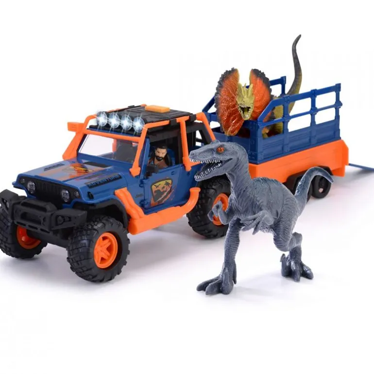 Gå tilbake til dinosaurenes tidsalder med Dickie Toys Dino lekesett! Dette lekesettet kommer med en offisielt lisensiert Jeep og er den perfekte gaven til enhver bil- og dinosaurelsker. I tillegg til et funksjonspakket kjøretøy, inkluderer settet også en stor tilhenger med bur, samt to dinosaurfigurer som kan transporteres i hengeren. I tillegg er Jeep utstyrt med myke dekk for å sikre at den ikke kjører ut av veien. Bilen har også lys- og lydeffekter som kan aktiveres ved å trykke på en knapp på taket og bidra til å stimulere barnets fantasi, samtidig som dørene til kjøretøyet og tilhengeren kan åpnes og lukkes for å oppbevare dinosauren og annet tilbehør. En bøyelig figur + to dinosaurer er inkludert i settet. Lengde: 40 cm. Dickie Toys Dino Commander lekesett passer barn fra 3 år. Batterier inkludert (3×1.5V LR44).