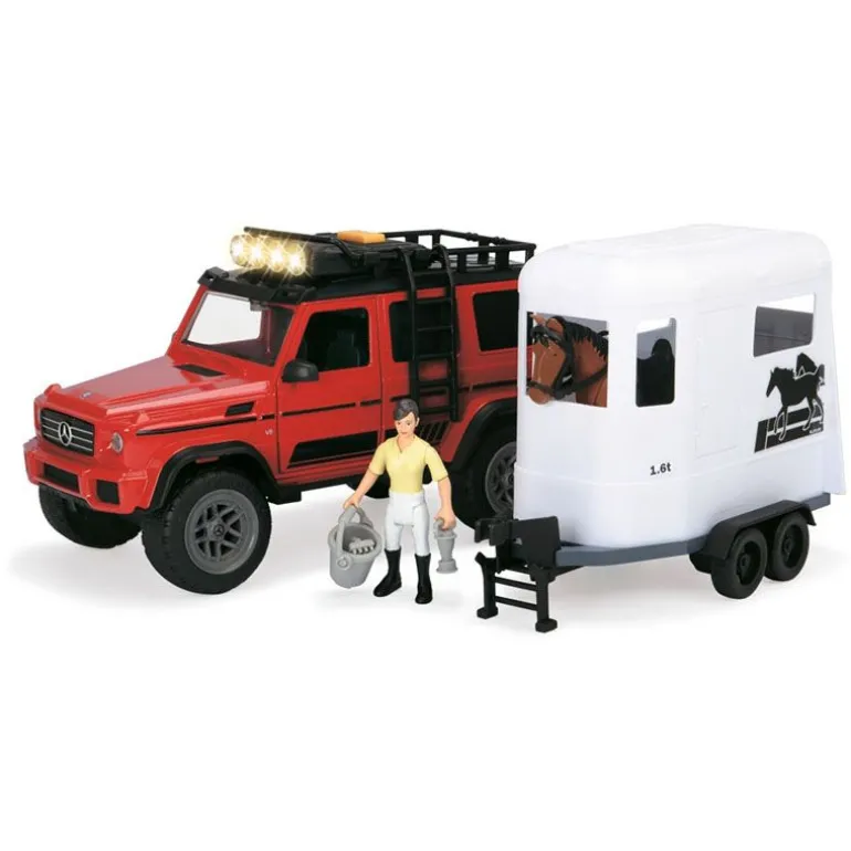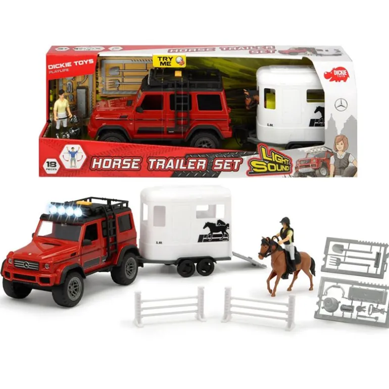 Mercedes med hestehenger og mye tilbehør fra Dickie Toys. Settet inkluderer totalt 18 deler, deriblant figur og hest. Med lyd og lys blir leken enda morsommere. Fra 3 år.