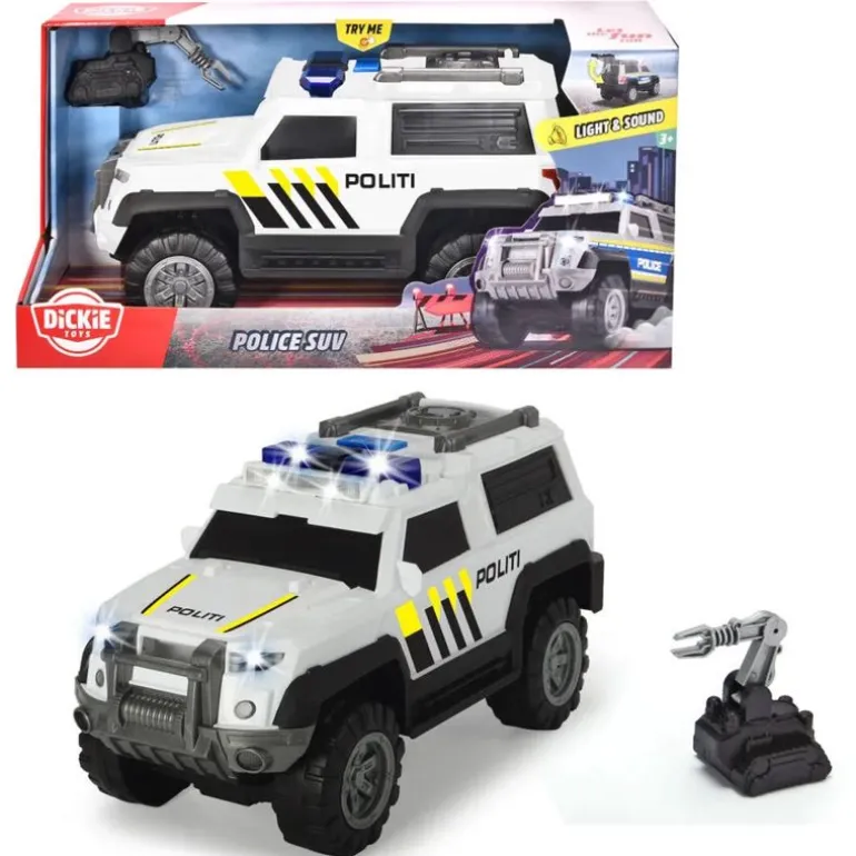 Med denne stilige politibilen fra Dickie Toys er det ingen skurker som kommer seg unna. Når alarmen går på politistasjonen er det bare å skru på blålyse å suse gjennom gatene! Lyden av sirenen sørger for at du kommer raskt frem for å stoppe alle kjeltringer. Når skurkene er fanget, er det bare å åpne bagasjerommet å plassere dem i baksetet på bilen før du drar tilbake til politistasjonen.