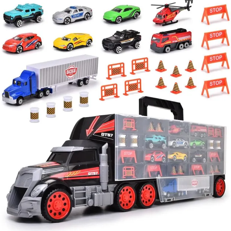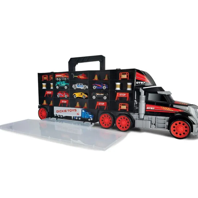Denne 62 cm lastebilen er den ultimate løsningen for oppbevaring av alle lekebilene dine. Den er også ideell for bruk på farten og å ta med på ferie. Settet inneholder 9 metallbiler og matchende tilbehør. Den inkluderer 8 kjøretøy og et helikopter fra støpte leketøysserien, som du kan bruke til å lage alle slags vei-tema-scenarier. Laget av metall, alle kjøretøyene er intrikat detaljerte og kan losses gjennom førerhuset via en innebygd rampe.