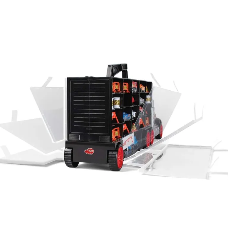 De enkelte kjøretøyene kan brukes som separate leker, mens biltransporteren har roterende hjul for enkel manøvrerbarhet. Designet for barn fra 3 år og oppover, og er perfekt for å oppmuntre den lille til å holde det ryddig. Bærevesken har to forskjellige nivåer og har plass til opptil 42 kjøretøy og tilbehør som veisperringer og kjegler, som sikrer at alt forblir ryddig og organisert.