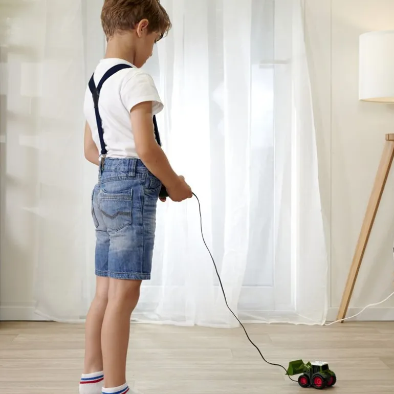 Kjøretøyet er spekket med morsomme funksjoner. Den store skuffen beveger seg automatisk når traktoren kjøres forover eller bakover, og lyseffekten aktiveres av seg selv når kjøretøyet kjører fremover. Perfekt for å stimulere fantasien og trene på finmotorikken! Det ledningsstyrte kjøretøyet kommer med en praktisk og brukervennlig to-knappskontroll – en for å kjøre rett frem og en for å kjøre bakover i en kurve.