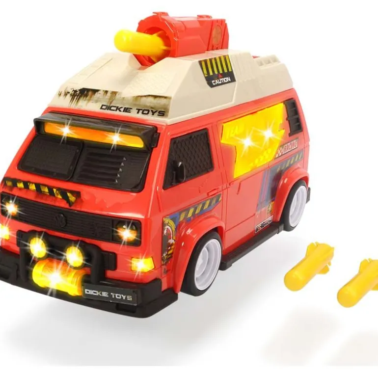 Kjør rundt med den stilige Volkswagen T3 Camperen fra Dickie Toys! Bilen kommer med tøffe motiver og morsomme lys- og lydeffekter. I tillegg kan du aktivere den skyte funksjonen på taket til bilen. Med tre skydd lagret bak i bilen kan du beskytte deg mot dine motstandere uten problemer.