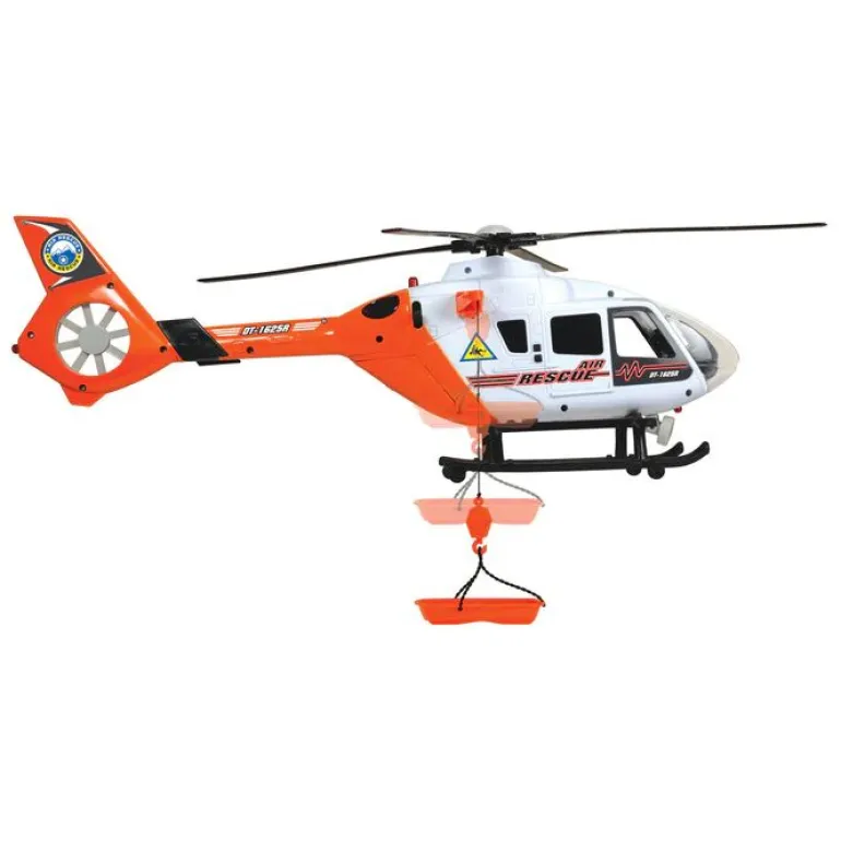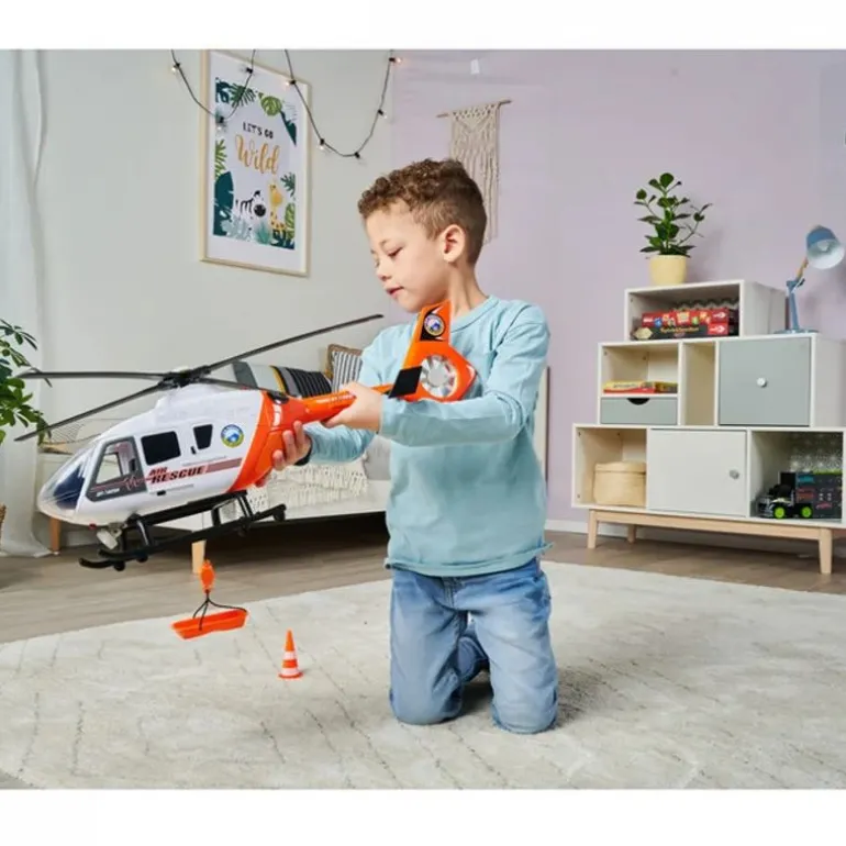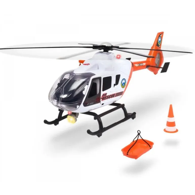 Å fly kombinert med å vise mot og nerver – det er med god grunn at luftambulansepiloter er forbilder for mange barn. Ungdom flyr på spennende lekeromsoppdrag med Dickie Toys Sos Rescue Helicopter. Den elektriske vinsjen og den roterende rotoren gir følelsen av å være virkelig nær handlingen. Lys- og lydeffekter følger eltene på deres eventyr. Du må være rask når det gjelder transport av ofre: en klaff bak lar det unge redningsteamet jobbe forsiktig. Helikopteret kommer med kjegler for å sperre av et område. I rollen som legevakt lærer barna alt om nødetatene – en flott gaveide. Gjør lekerommet til scenen for handlingen og lær unge redningsmenn om alt om nødredning gjennom lek!