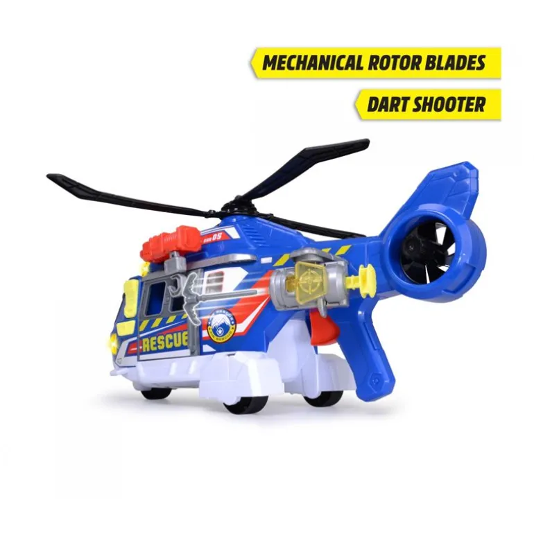 Helikopteret er utstyrt med to kanoner som kan skyte prosjektiler med et enkelt knappetrykk – perfekt for adrenalinfylte eventyr! Med i settet følger også en gul båre, som kan løftes via den motoriserte kabelvinsjen for å bringe skadde personer i sikkerhet. Båren har plass til leketøysfigurer på opptil 8 cm lengde (ikke inkludert). Den roterende propellen kan betjenes ved å trykke gjentatte ganger på knappen på håndtaket. Og den funksjonelle kranearmen lar barna gjenskape typiske redningsscener.