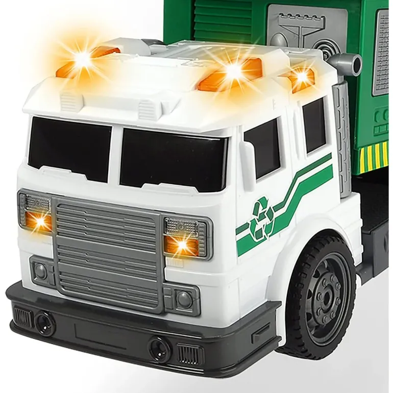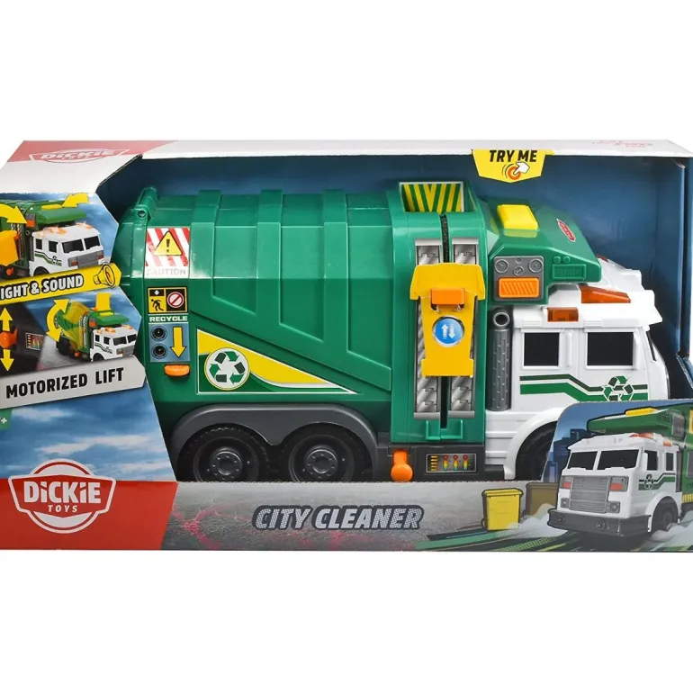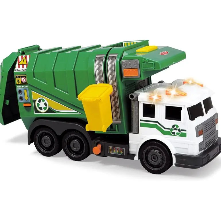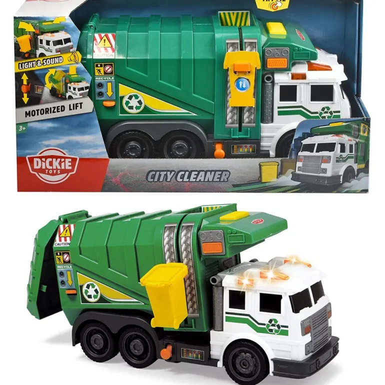 Dickie toys søppelbil med batteridrevet heis for søppelkasse, mulighet til å åpne bakluke, med tippehenger og lys- og lydeffekter, med ekstra søppelkasse inkludert. Krever 2 X AA batterier som følger med. Anbefalt aldersgrense 3+