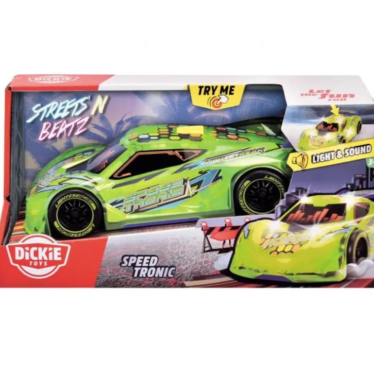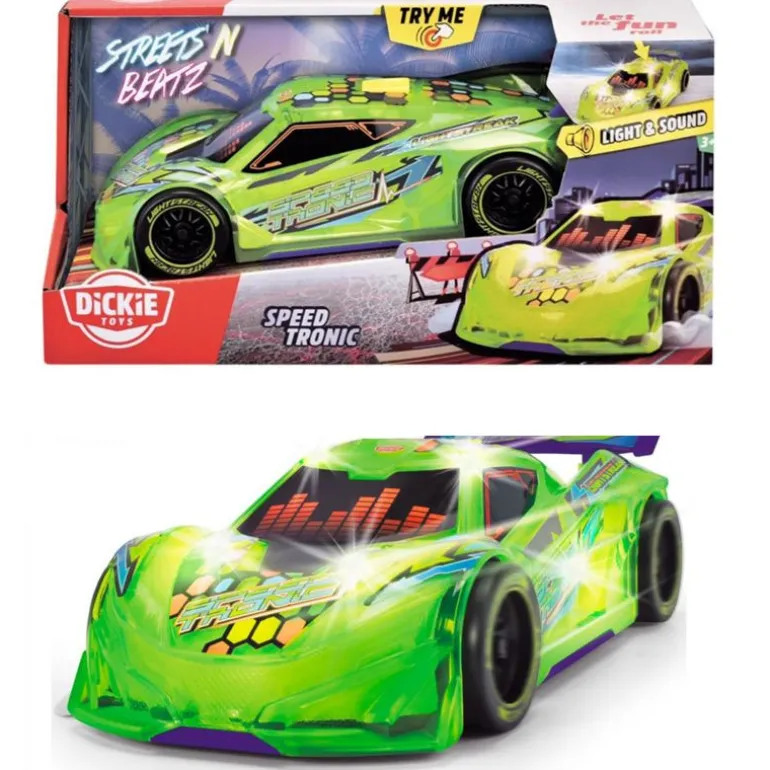 Denne lekebilen er utstyrt med et innebygd musikksystem som spiller morsomme og engasjerende sanger. Perfekt for å sette stemningen for lekeeventyr! Med blinkende lyseffekter, gir Speed Tronic barnet ditt muligheten til å skape spennende scener og utforske verden med fantasi og glede. Lekebilen har et detaljert utforming og autentiske farger, noe som gir barnet ditt en realistisk lekeopplevelse.