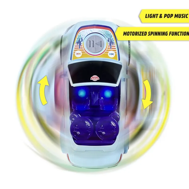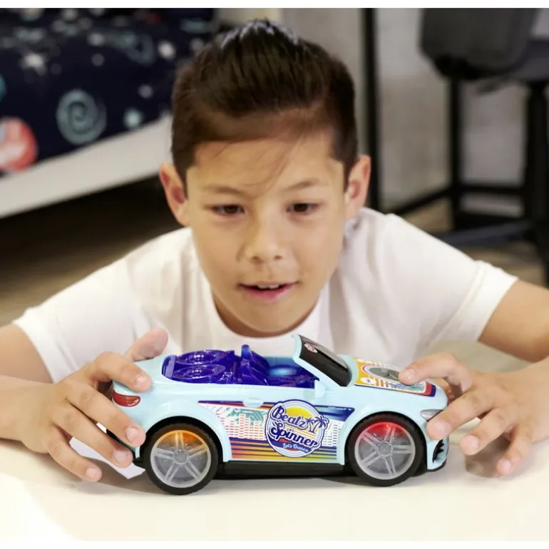Dickie Toys Mercedes-Benz E Class Beat Spinner (23,5 cm) er en selvkjørende lekebil fra STREETS N BEATZ-serien. Trykk på knappen for å få bilen til å snurre! Kjøretøyet kan utføre to forskjellige bevegelser: «Bump and Go» og «Spin Action». Det motoriserte kjøretøyet endrer automatisk retning når det treffer en gjenstand eller vegg.