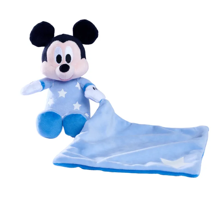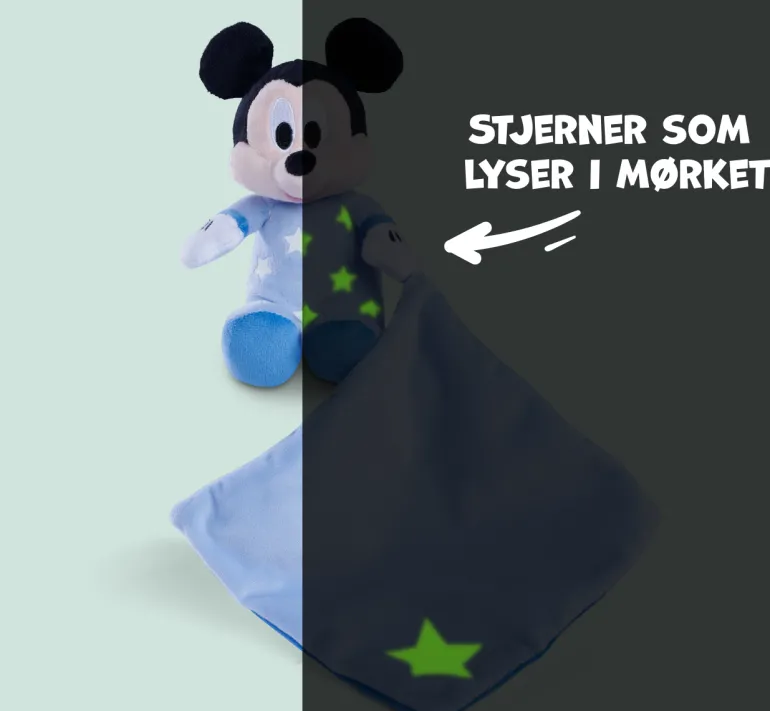Disney Mikke Mus, den berømte musen som kosedyr 15 cm lang med koseklut i uimotståelig myk kvalitet, og med lysende stjerner som skinner i mørket. Det myke Disney-kosedyret med koseklut fra Simba Toys vil raskt bli en god venn hjemme. Passer barn fra de første månedene av livet.