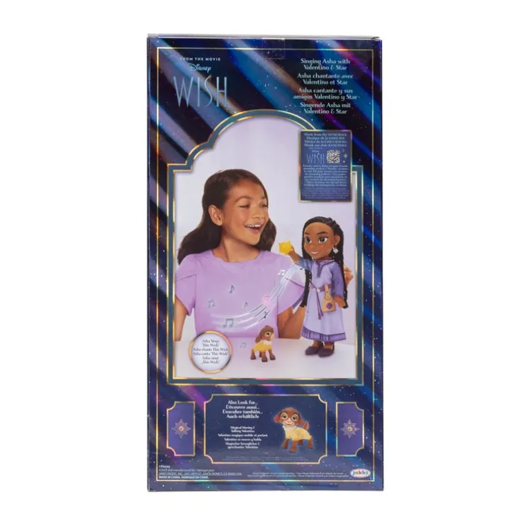 Asha sier også 20 setninger slik at du kan spille ut favorittfilmøyeblikkene dine. Syngende Asha har sin tradisjonelle flettefrisyre, stylet for hånd, og er ikledd hennes vakre lilla signaturantrekk og tilbehør akkurat som i Disneys nye animasjonsfilm Ønske.