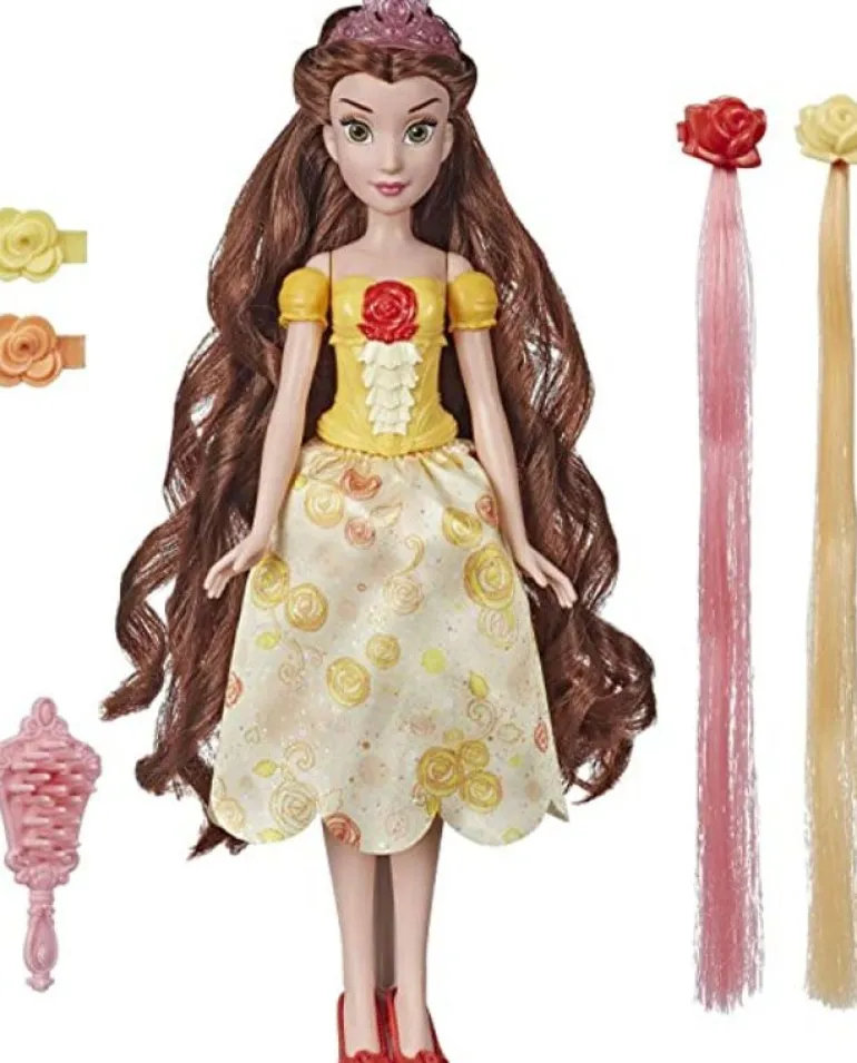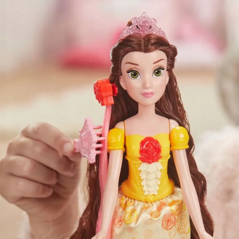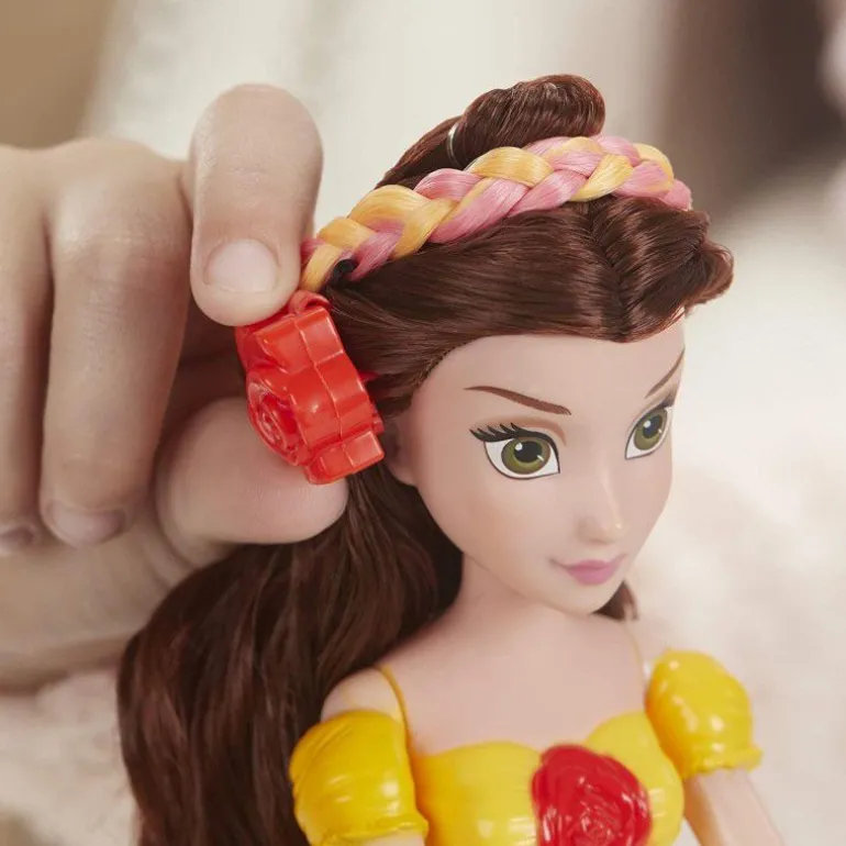 Nå kan du style det flotte håret til Belle fra den morsomme Disney filmen ‘Skjønnheten og Udyret’!Bruk hår klipsene for å sette inn en oransje eller rosa stripe – eller bruk begge samtidig.Lag fletter eller ha håret til Belle hengende løst med klemmer i gul og oransje som pynt.Bruk den rosa børsten som følger med for å greie håret til Belle slik at det blir mykt og glansfullt.Belle har på seg sitt karakteristiske antrekk med et avtagbart glitter skjørt og en flott rosa tiara som kan tas av og på.Passer fra 3 år+