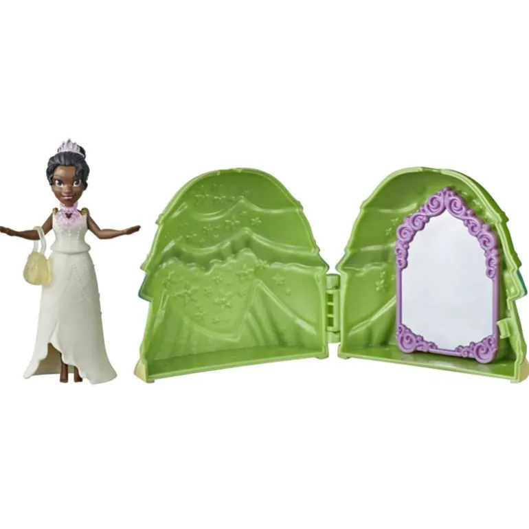 Åpne en verden med fantasifull og kreativ lek med de flotte Disney prinsesse fashion surprise dukkene! Skjørtet åpnes opp og avslører et lite rom med speil som Tiana kan bruke når hun skal pynte seg med de flotte kjolene sine. Dette rommet er også den perfekte oppbevaringsplassen når lekesettet ikke er i bruk. Kle Tiana opp i 2 forskjellige skjørt, 2 forskjellige overdeler, 2 flotte par sko, et smykke, og 2 vesker. Barn kan mikse og matche for å eksperimentere med forskjellige flotte antrekk til Tiana. Antrekkene til de flotte prinsessen er inspirert fra Disney filmen «Prinsessen og Frosken». Gjenskap dine favoritt scener fra filmen eller dra ut på nye eventyr sammen med Tiana.