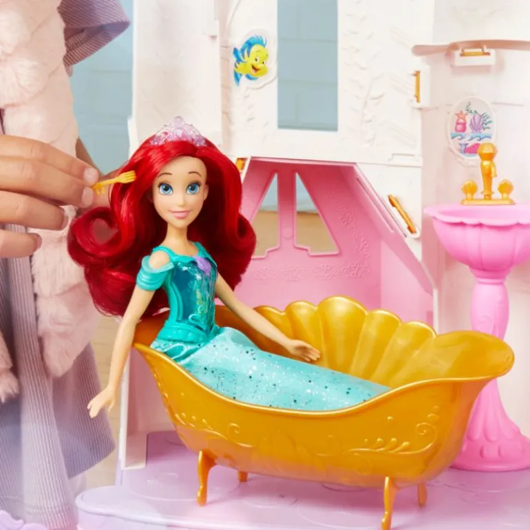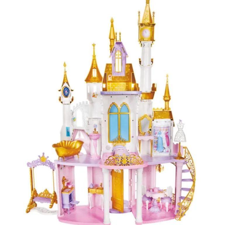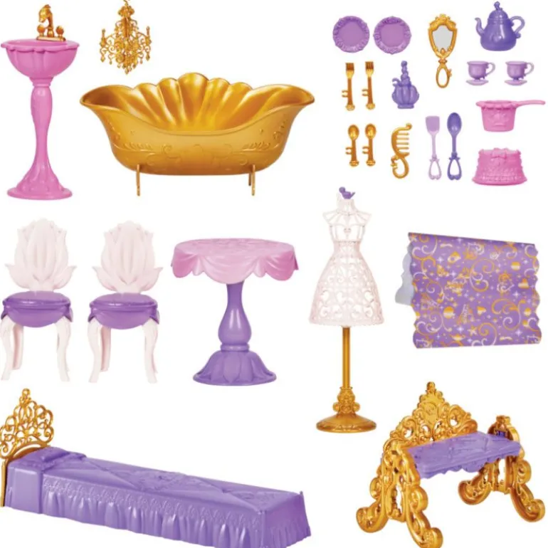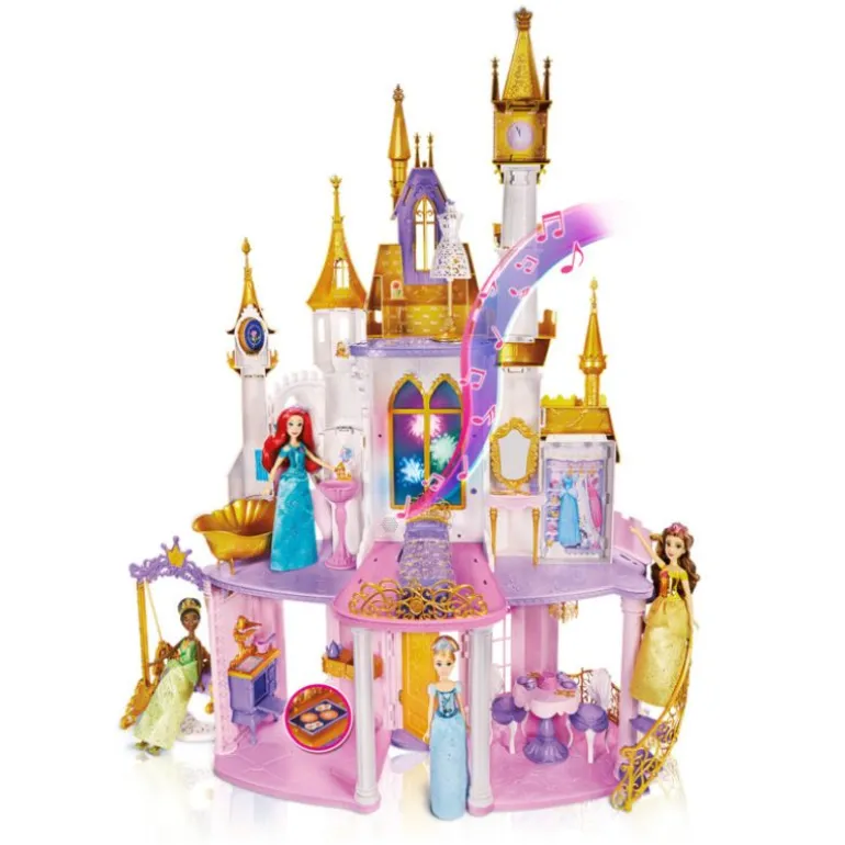 Feir sammen med Disney Prinsesse-karakterene i det ultimate prinsesseslottet! Dette slottet er 122 cm høyt med sin klassiske silhuett og har 3 etasjer og 6 rom, inkludert et bad med badekar og vask, soverom med seng og servantskap, et kjøkken med komfyr og en spisestue med bord og stoler. Vinduet ovenpå lyser opp som fyrverkeri mens musikken spilles, så barna kan forestille seg Disney Prinsesse-karakterene som ser på et spektakulært fyrverkeri. Settet inneholder også 29 tilbehør, som gafler, skjeer, en tekanne, tekopper, tallerkener, en kam, speil og mer for å hjelpe barnas fantasi til å komme til live. Det er en sofa som kan gjøres om til en hagehuske for utsiden av slottets lekesett.