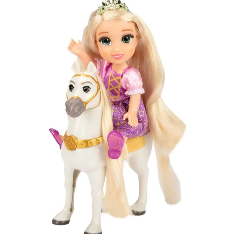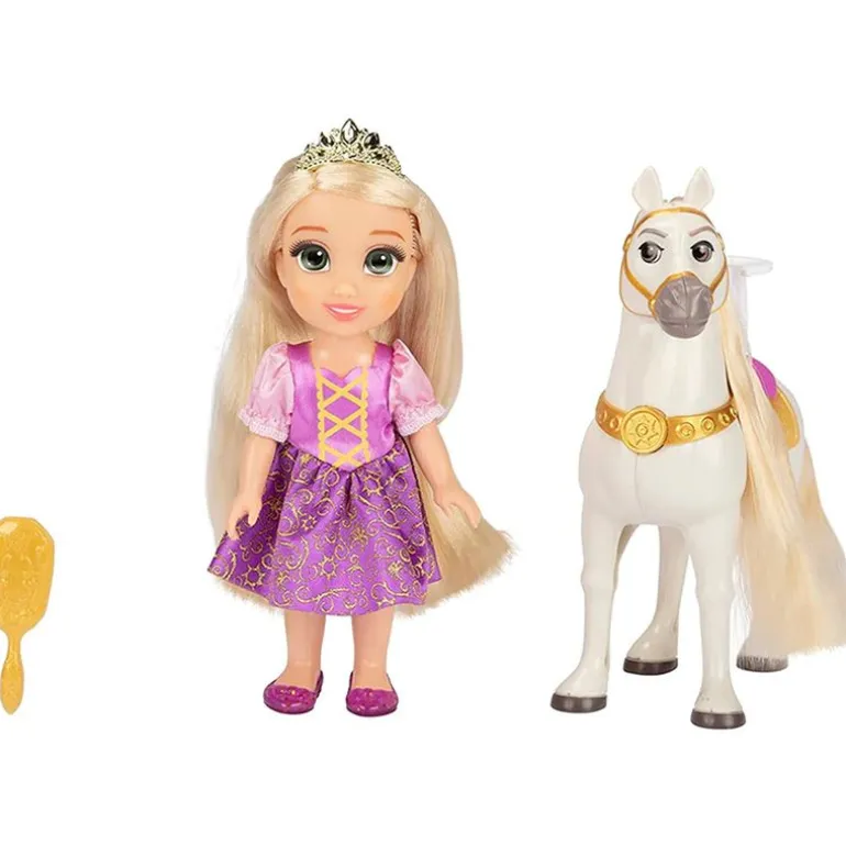 Disney Princess Rapunzel & Maximus er et morsomt lekesett hvor både dukken og hesten kommer men med langt hår som kan styles med den medfølgende børsten. Rapunzel er kledd i sine ikoniske klær med en gyllen hårbørste. Maximus med lang manke og gylne detaljer.