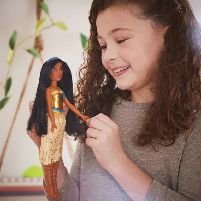 Royal Shimmer prinsesse dukkene både skinner og glitrer fra topp til tå. Prinsesse Pocahontas kommer i sitt klassiske brune antrekk med matchende sko og en hårbøyle i blå. Gjenskap din favoritt scene fra Disney filmen «Pocahontas» eller dra ut på dine egne nye eventyr sammen med Pocahontas.