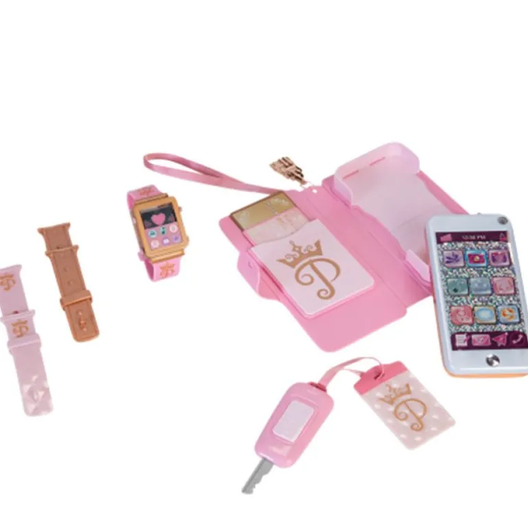 I dette stilige Disney Prinsesse settet får du med både en leke smartphone med deksel, en stilig klokke og nøkler. Klokken kommer i et flott og moderne design med feste i forskjellige farger slik at du kan bytte ut når du ønsker. Beveg på knappene på klokka for å se at den lyser. Smarttelefonen kommer med et realistisk design og har en ‘blitz’ funksjon som du kan utløse når du skal fotografere. Det flotte rosa dekselet kommer med et gummi bånd slik at du kan feste den rundt håndleddet for å ikke miste den.