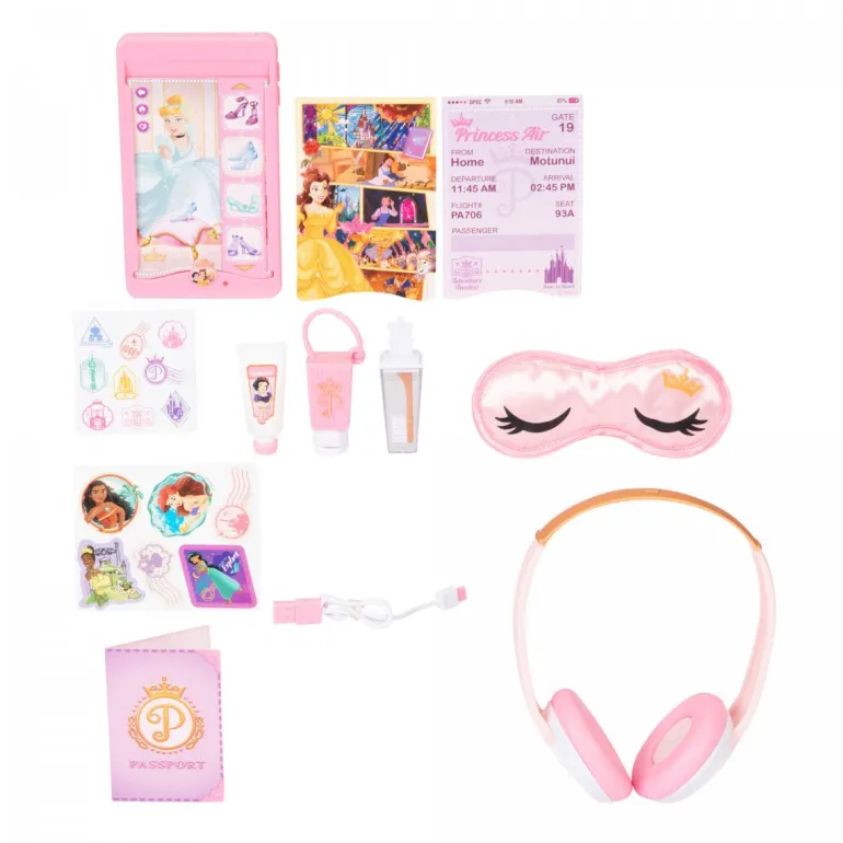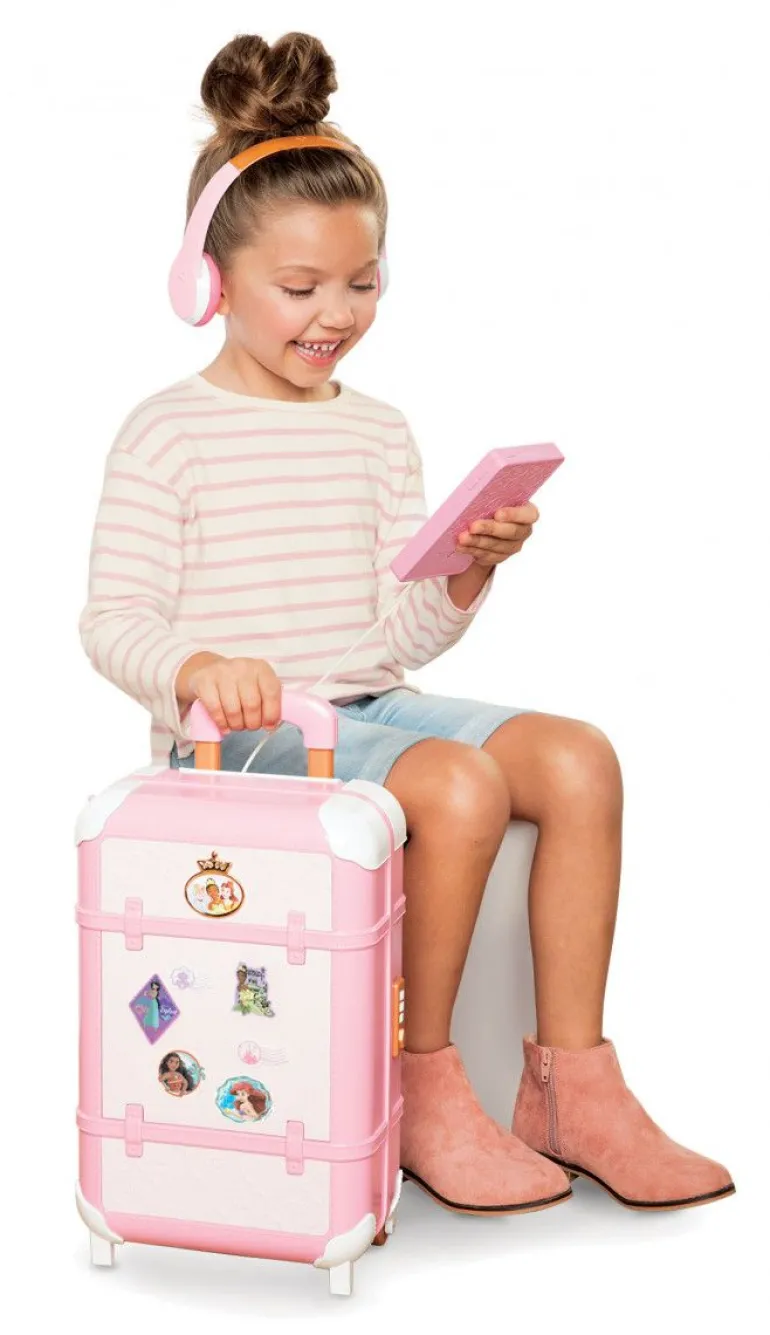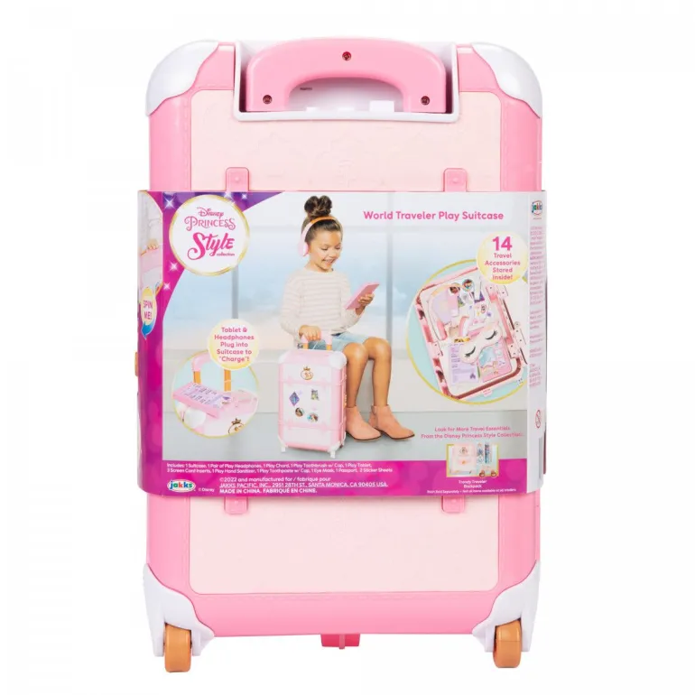 Disney Princess Style Collection World Traveler lekekoffert har alt en prinsesse trenger for å reise med stil! Den har alt du trenger for å reise, og oppbevares perfekt i den stilige og oppdaterte lekekofferten. Lat som om du sikrer eiendelene dine med den falske kombinasjonslåsen. Hold kontakten på flyplassen ved å koble til nettbrettet ditt, eller frisk deg opp før avgang med lekeleppepomaden og hånddesinfeksjon. De ekte fungerende hjulene og det uttrekkbare håndtaket sørger for at du alltid rekker flyturen! Slapp av på flyet med lekehodetelefonene og sovemasken. Med pass og billett i folioen, er du klar til å dra på eventyr til fjerne steder!