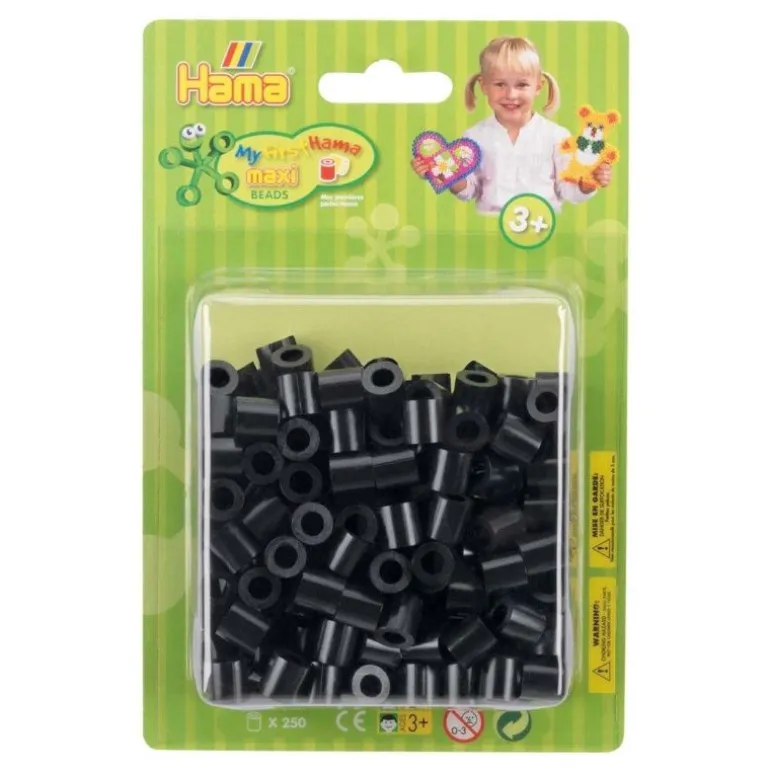 Sammen med andre flotte Hama perler og perlebrett kan det lages utallige mønster og figurer. denne pakken består av 250 Hama Maxi perler i en svart farge. Hama Maxi er perfekt for de små for å la dem bruke fantasien og kreativiteten sin ved å perle stilige figurer.