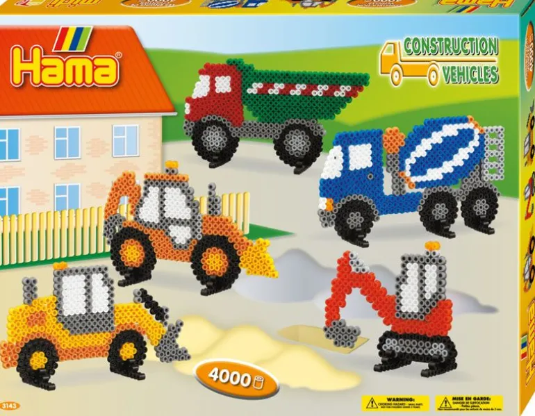 Flott Hama Midi gaveeske med 4000 perler i ulike farger, 1 lastebil perlebrett, 11 perleføtter og motivark som viser hvordan en perler stilige anleggskjøretøy. Inkludert er også veiledning og strykepapir.